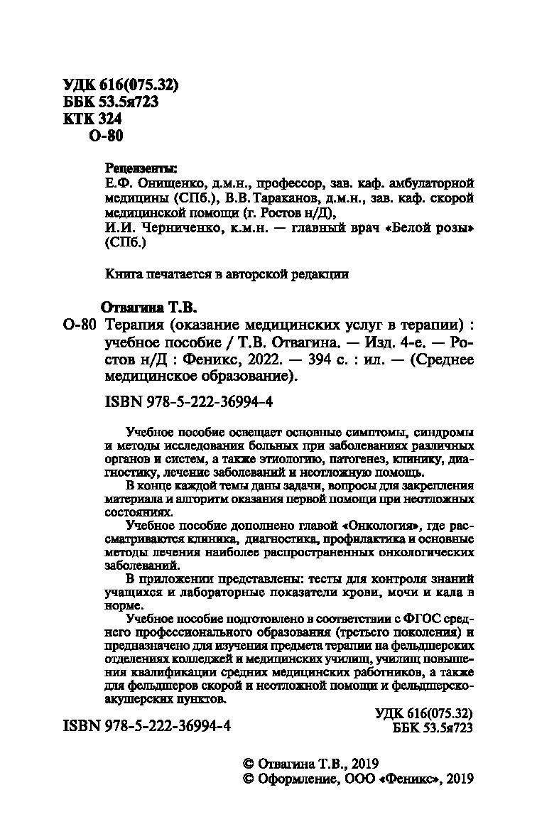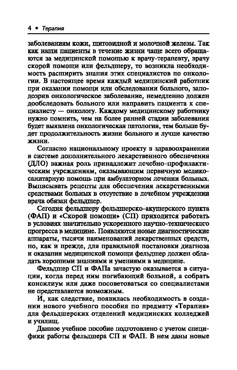 Учебное пособие подготовлено в соответствии с ФГОС среднего профессионального образования (третьего поколения) и предназначено для изучения предмета терапии на фельдшерских отделениях колледжей и медицинских училищ, училищ повышения квалификации средних медицинских работников, а также для фельдшеров скорой и неотложной помощи и фельдшерско-акушерских пунктов.