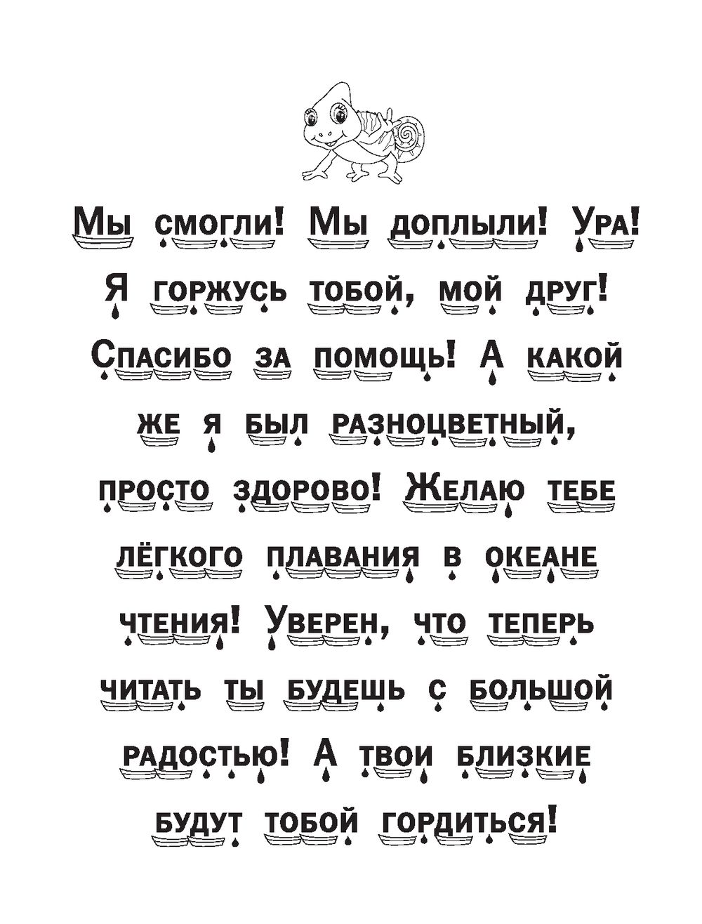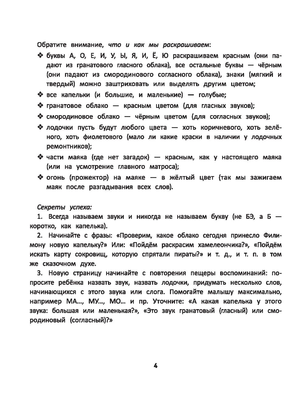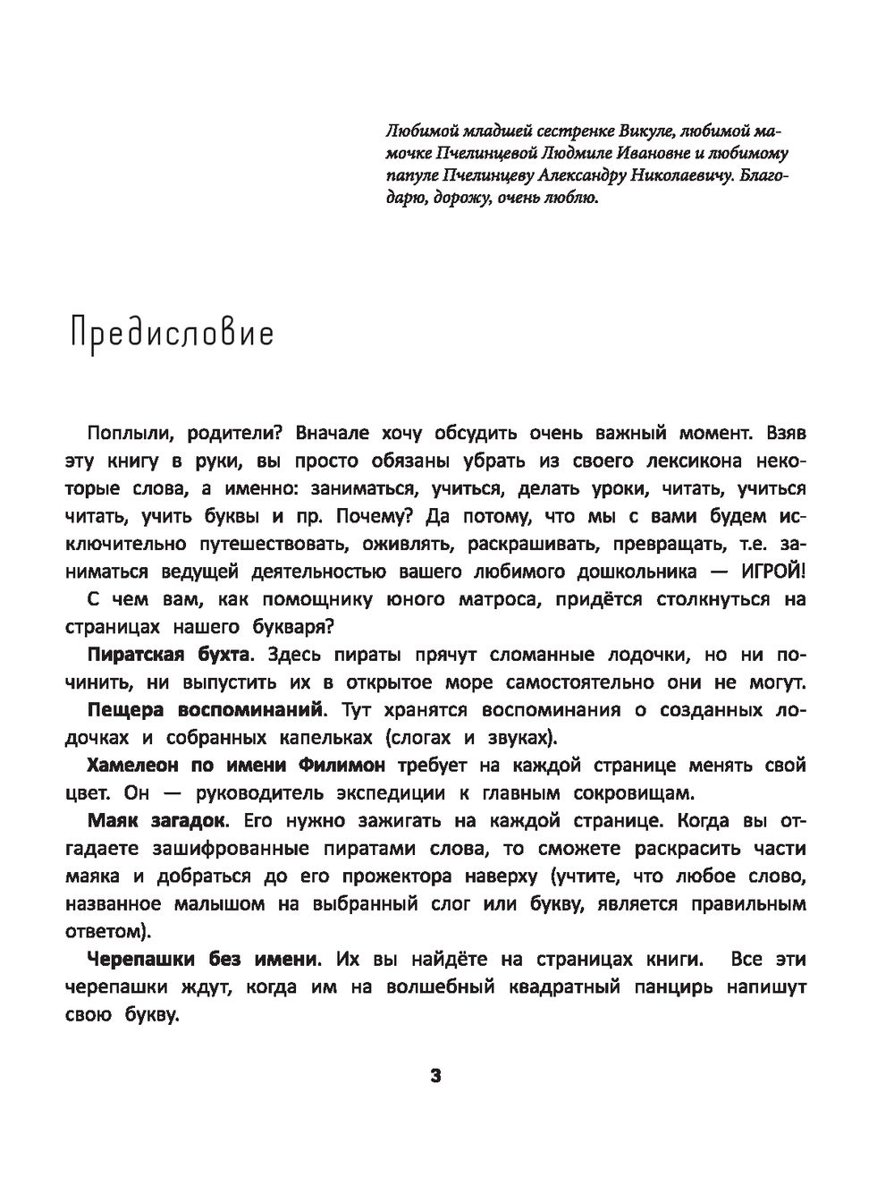 Этот дошкольный букварь для самых маленьких детей написан по многочисленным просьбам мам. Букварь уникален тем, что ребенок в процессе игры (а это ведущая деятельность дошкольника) узнает о звуках, развивает фонематическое восприятие, учится складывать слоги и читать первые слова. Букварь – это огромная раскраска увлекательных приключений с хамелеоном Филимоном. Именно эта особенность позволит вашему ребенку заниматься с удовольствием и, как следствие, порадует вас отличным конечным результатом. Ваш юный матрос будет искать гранатовые и смородиновые тучки, чинить поломанные лодочки, зажигать маяки, писать буквы на черепашьих панцирях и раскрашивать хамелеона в зависимости от его настроения. А в конце пути при помощи наклеек – морских звёзд – он доберётся до самых настоящих пиратских сокровищ. И так, постепенно, в процессе увлекательной игры, ребёнок сделает новый шаг в обучении чтению.