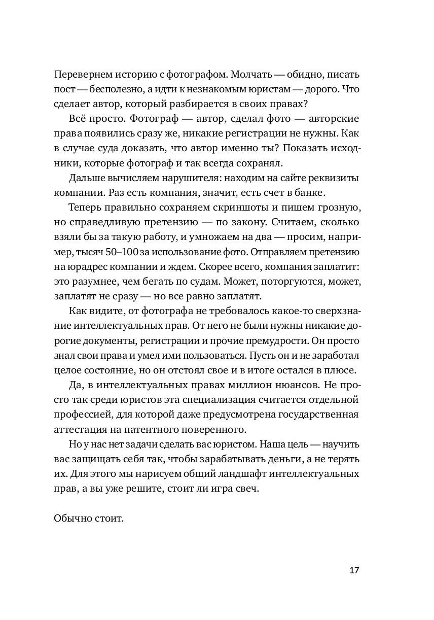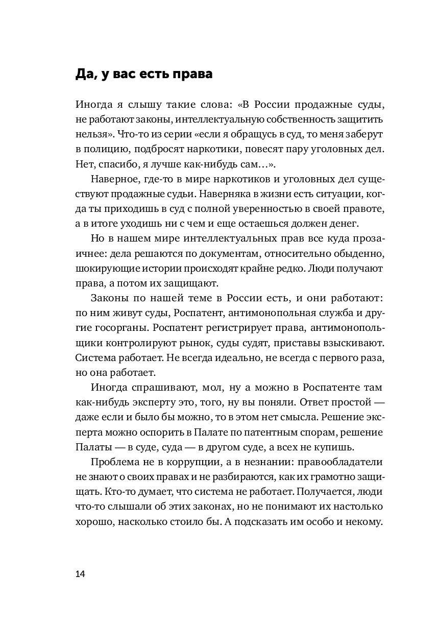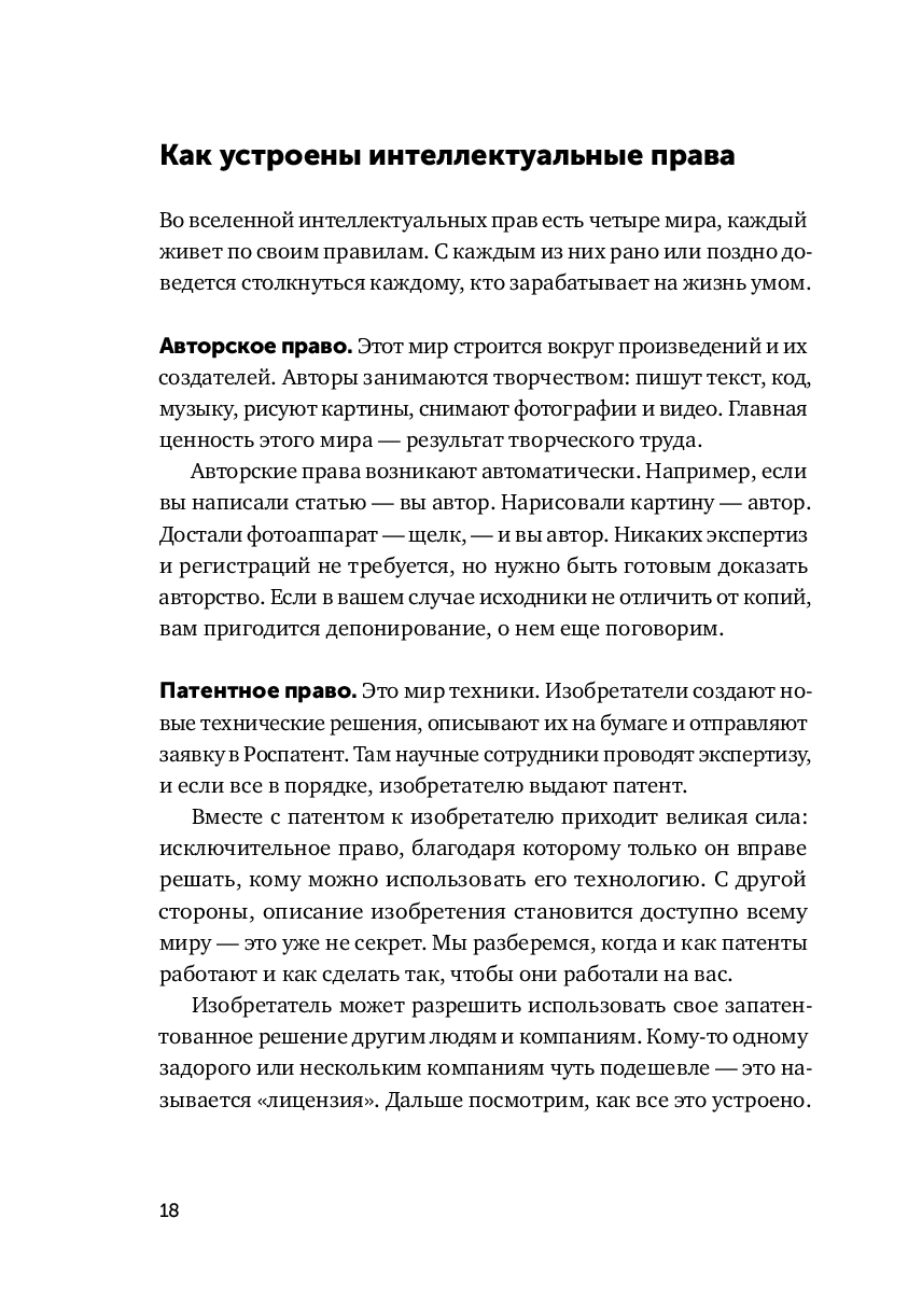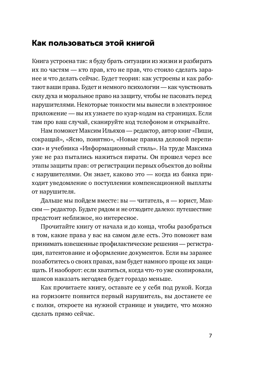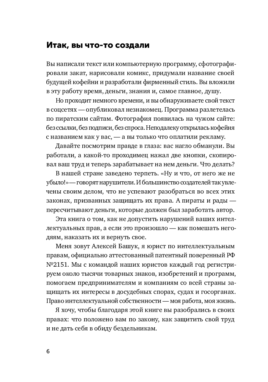 Если вы открыли эту книгу, то наверняка что-то создаете – текст, код, фото, музыку или строите собственный бизнес. А значит, рано или поздно кто-то без спроса может взять созданное вами и выдать за свое. Тогда вам понадобится защитить свои права. Юрист Алексей Башук вместе с автором "Пиши, сокращай", "Ясно, понятно" и других бестселлеров о копирайтинге и редактуре Максимом Ильяховым написали очень полезную книгу в помощь всем, кто зарабатывает деньги своими руками и умом. Подробно, компетентно и с обилием практических примеров они рассказывают, как работает российская система авторского права, зачем на самом деле нужны патенты и товарные знаки, как не терять деньги на компенсациях и штрафах и отстаивать свои права в битве с плагиаторами, пиратами и конкурентами.