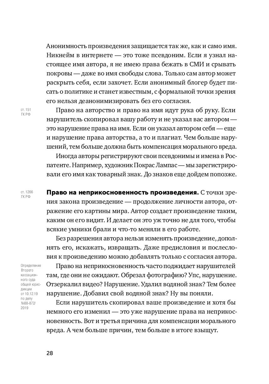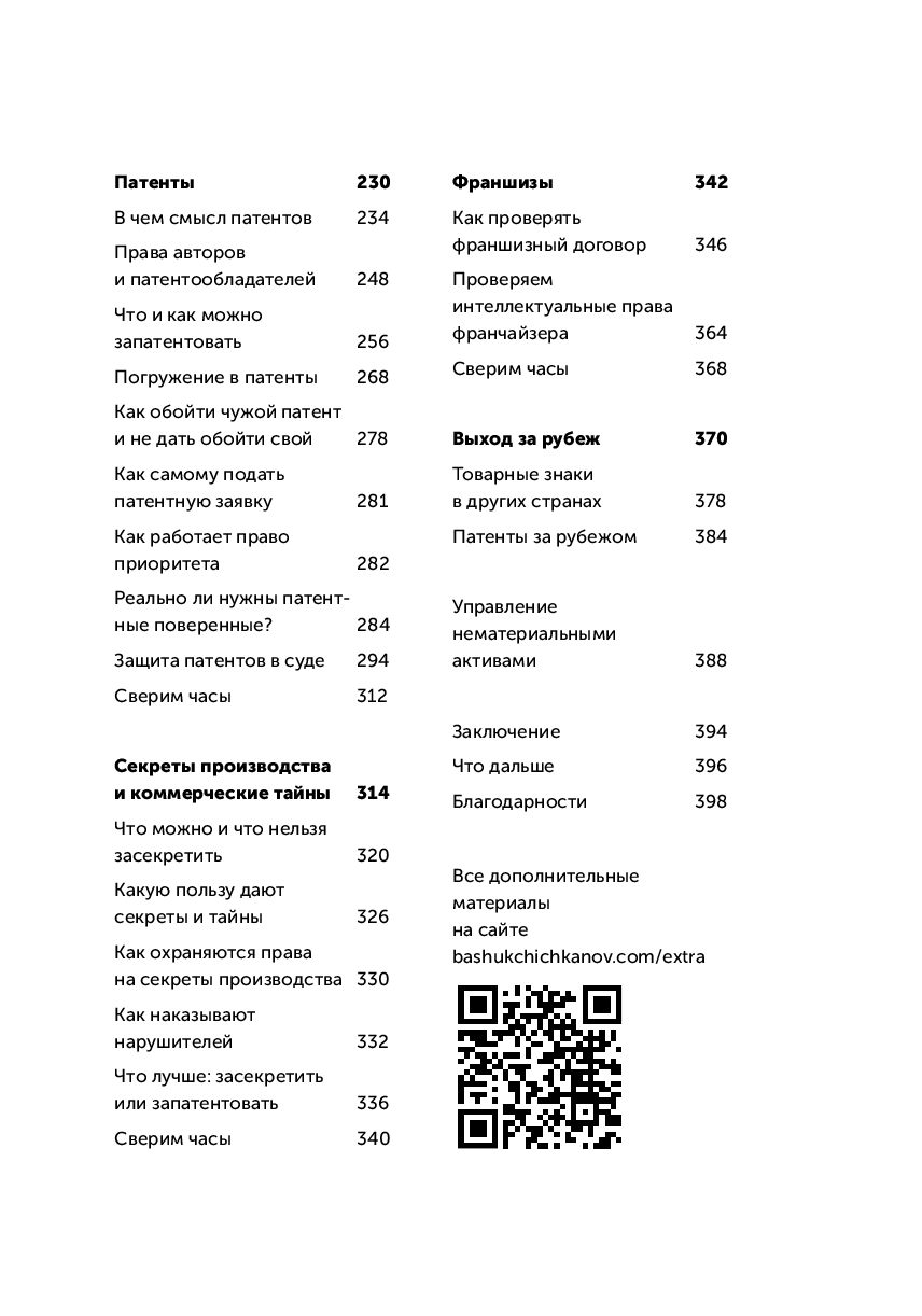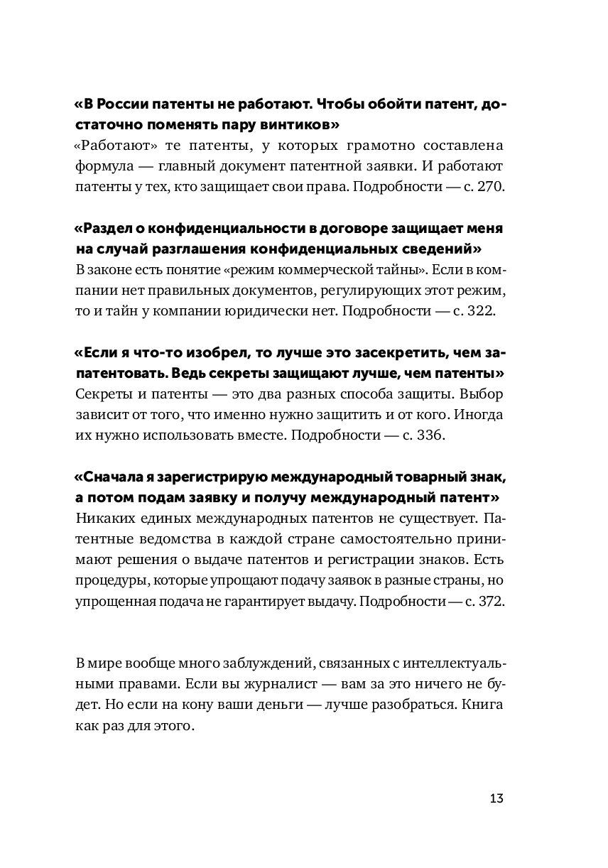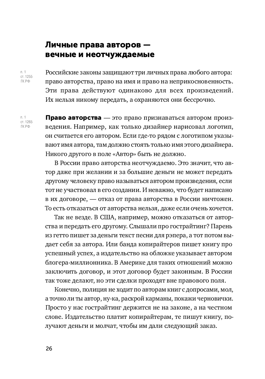Если вы открыли эту книгу, то наверняка что-то создаете – текст, код, фото, музыку или строите собственный бизнес. А значит, рано или поздно кто-то без спроса может взять созданное вами и выдать за свое. Тогда вам понадобится защитить свои права. Юрист Алексей Башук вместе с автором "Пиши, сокращай", "Ясно, понятно" и других бестселлеров о копирайтинге и редактуре Максимом Ильяховым написали очень полезную книгу в помощь всем, кто зарабатывает деньги своими руками и умом. Подробно, компетентно и с обилием практических примеров они рассказывают, как работает российская система авторского права, зачем на самом деле нужны патенты и товарные знаки, как не терять деньги на компенсациях и штрафах и отстаивать свои права в битве с плагиаторами, пиратами и конкурентами.