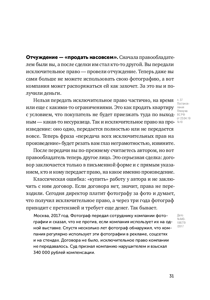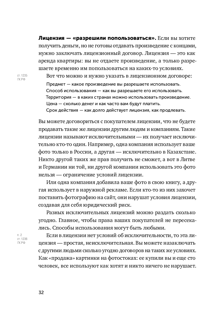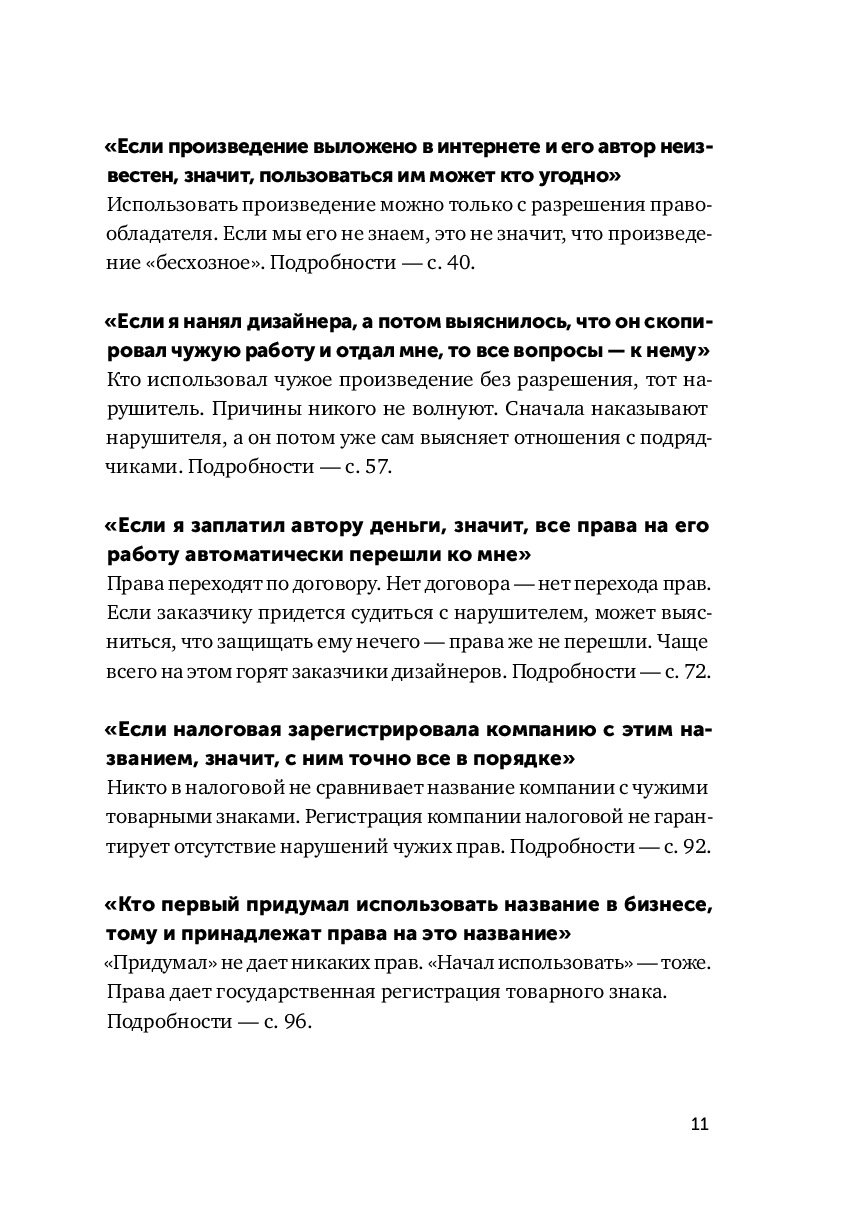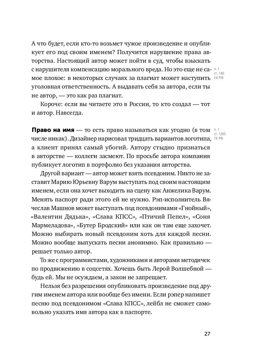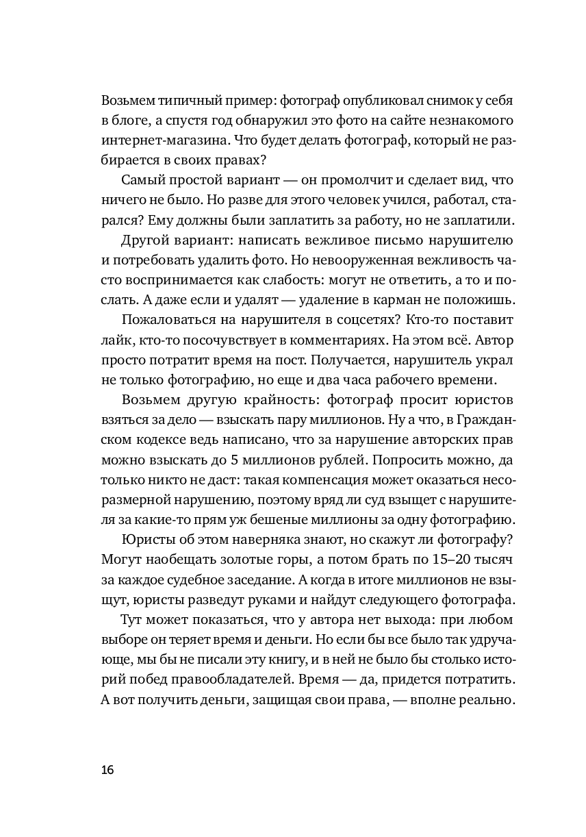 Если вы открыли эту книгу, то наверняка что-то создаете – текст, код, фото, музыку или строите собственный бизнес. А значит, рано или поздно кто-то без спроса может взять созданное вами и выдать за свое. Тогда вам понадобится защитить свои права. Юрист Алексей Башук вместе с автором "Пиши, сокращай", "Ясно, понятно" и других бестселлеров о копирайтинге и редактуре Максимом Ильяховым написали очень полезную книгу в помощь всем, кто зарабатывает деньги своими руками и умом. Подробно, компетентно и с обилием практических примеров они рассказывают, как работает российская система авторского права, зачем на самом деле нужны патенты и товарные знаки, как не терять деньги на компенсациях и штрафах и отстаивать свои права в битве с плагиаторами, пиратами и конкурентами.