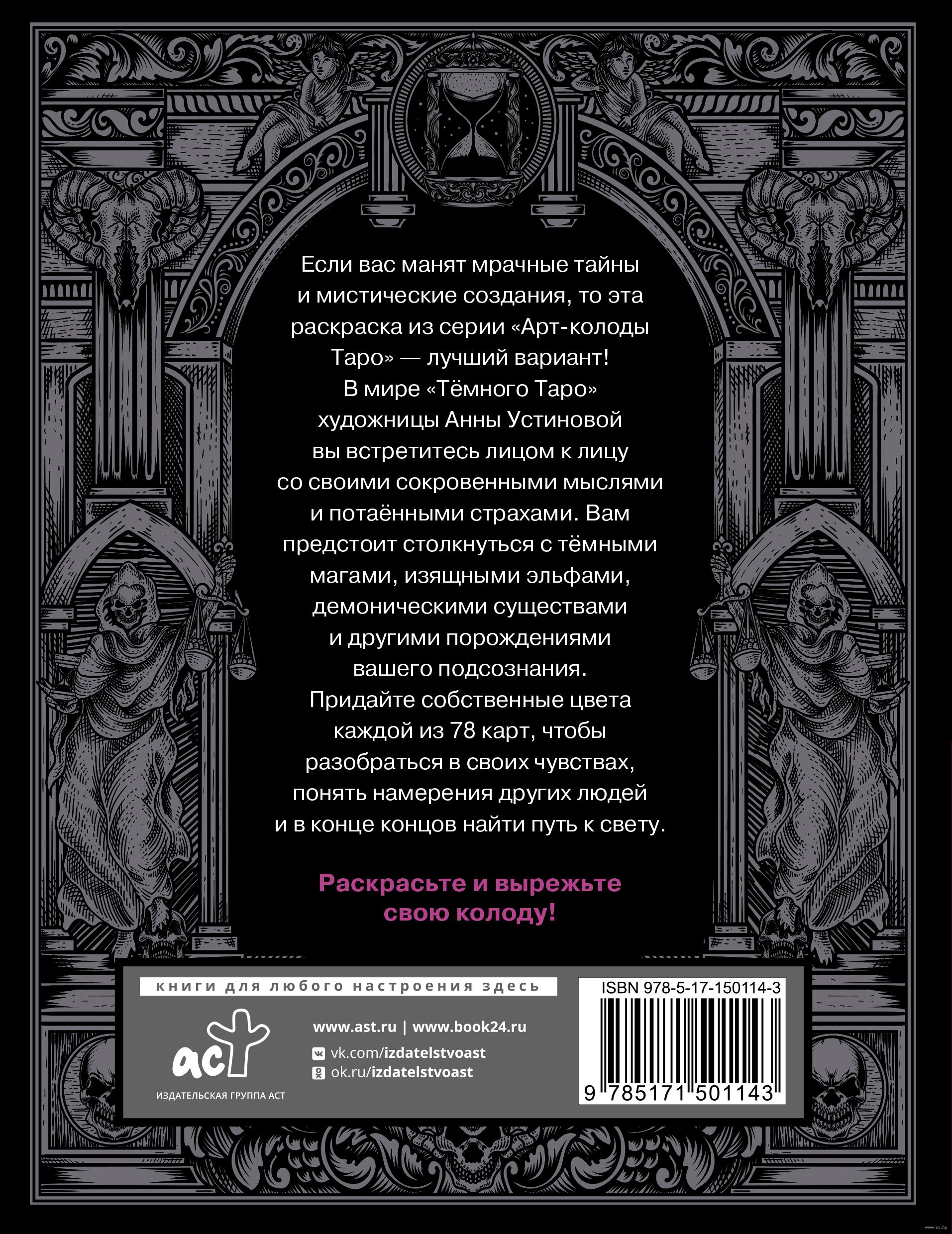 Раскраска с уникальными иллюстрациями петербуржской художницы Анны Устиновой. Колода для раскрашивания из 78 карт с рубашками, наполненных мрачными образами загадочных существ, которую оценят любители мистики и тёмной эстетики.