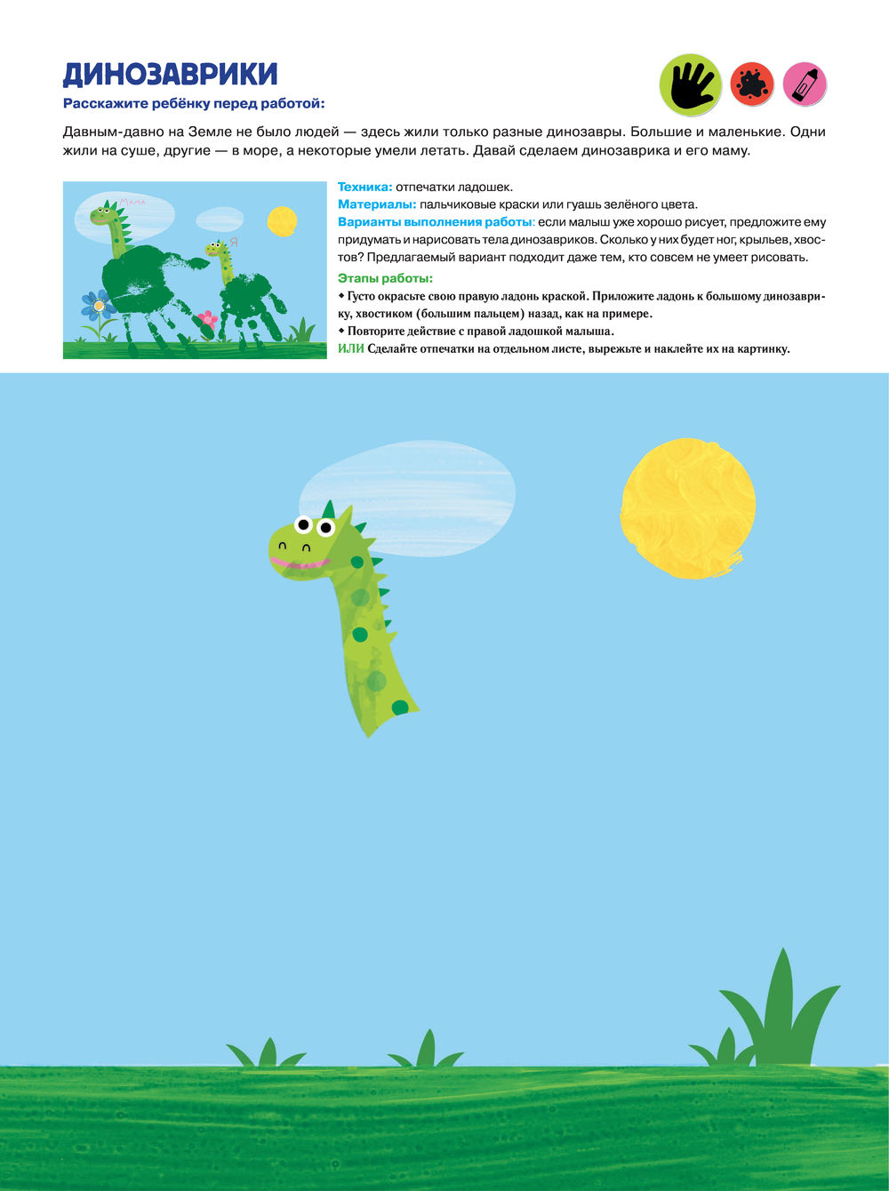 В альбоме 60 арт-листов и 40 готовых занятий. В пособии собраны все развивающие творческие техники для самых маленьких: простая аппликация, рисование ладошками, ножками, пластилином, пальчиками, кисточкой и восковыми мелками.