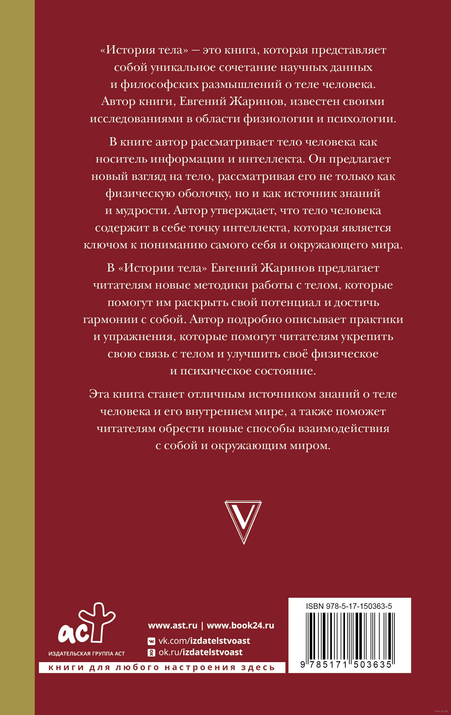 "История тела" – это книга, которая представляет собой уникальное сочетание научных данных и философских размышлений о теле человека. Автор книги, Евгений Жаринов, известен своими исследованиями в области физиологии и психологии. В книге автор рассматривает тело человека как носитель информации и интеллекта. Он предлагает новый взгляд на тело, рассматривая его не только как физическую оболочку, но и как источник знаний и мудрости.