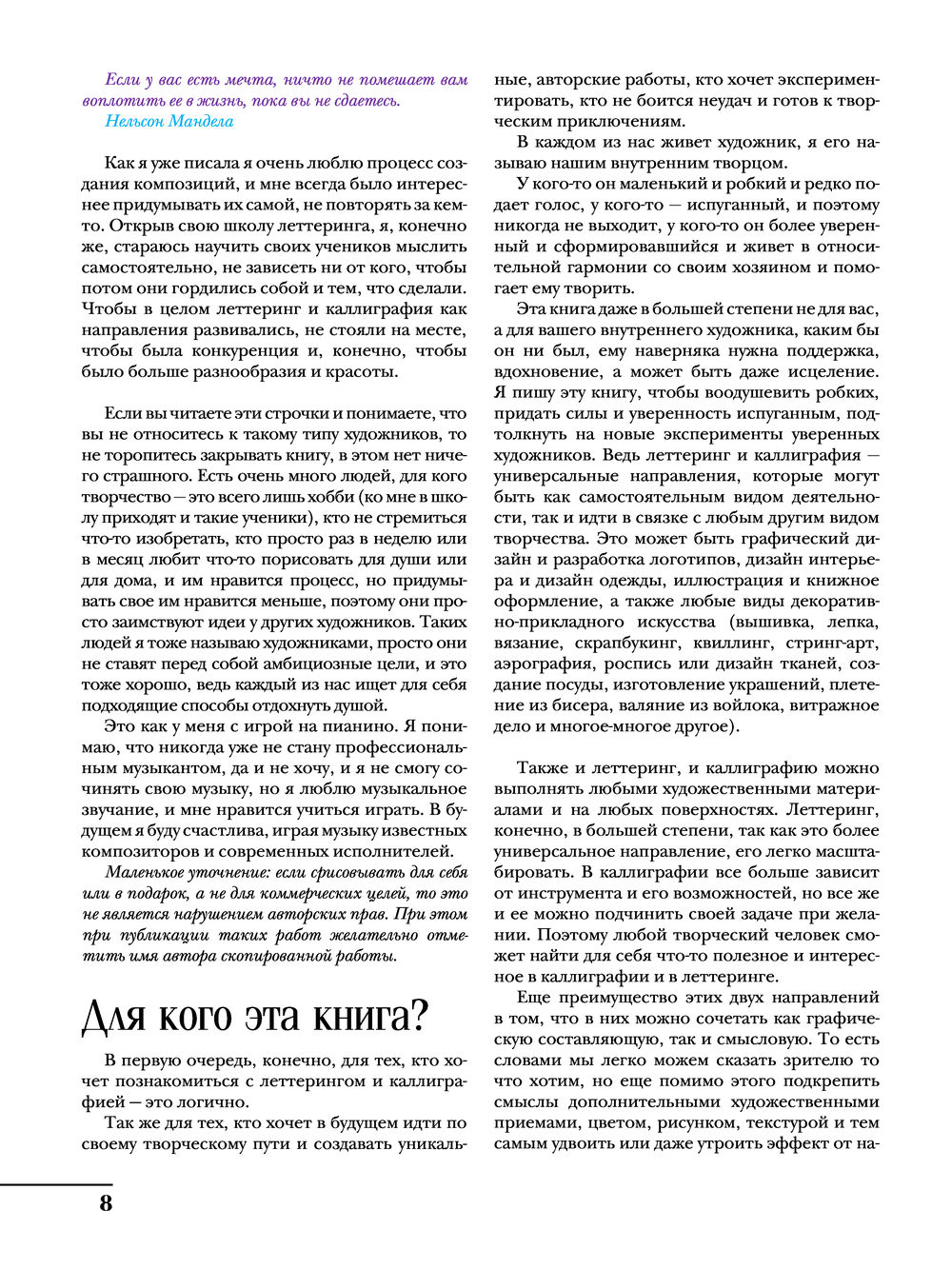 Курс позволит узнать огромные возможности этих направлений, отлично подойдет для тех, кто только начинает свой творческий путь. Вы изучите основные стили в леттеринге и каллиграфии и создадите свои первые работы. Теория и практические советы, представленные в книге, пригодятся не только начинающим художникам, но и всем творческим людям, работа которых связана с индивидуальным и креативным подходом в различных областях: рекламе, фешн-индустрии, производстве визиток или печати журналов, дизайне помещений и других.