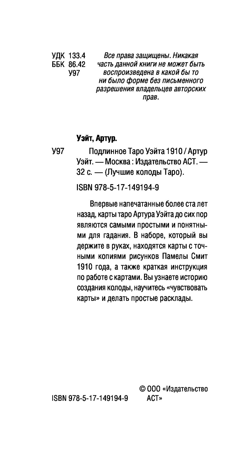 В набор входят 78 красочных оригинальных карт Таро Уэйта и инструкция для гадания. То, что нужно, чтобы сразу начать гадать! Набор упакован в небольшую коробку, сделанную под размер карт.