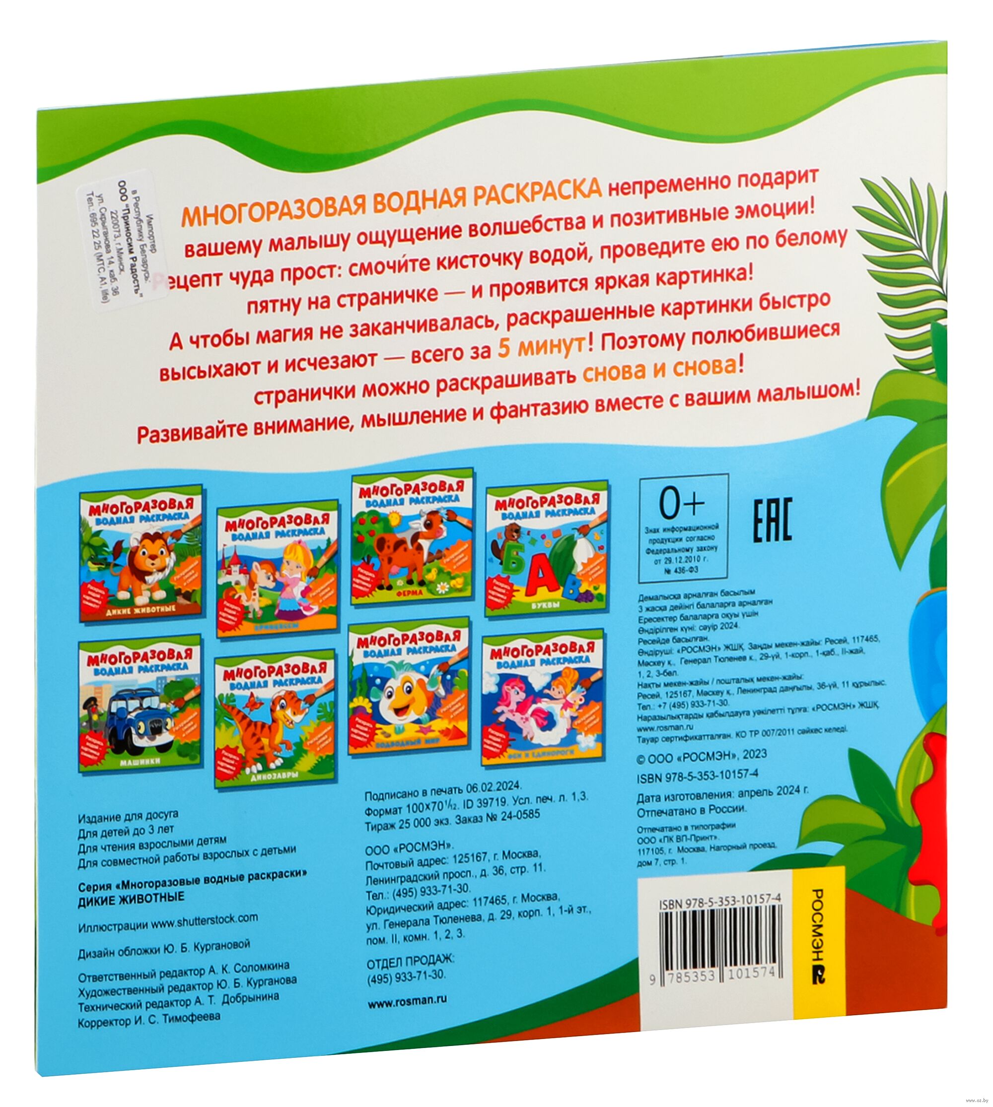Рецепт чуда прост: смочите кисточку водой, проведите ею по белому пятну на страничке – и проявится яркая картинка. А чтобы магия не заканчивалась, раскрашенные картинки быстро высыхают и исчезают – всего за 5 минут. Поэтому полюбившиеся странички можно раскрашивать снова и снова. Развивайте внимание, мышление и фантазию вместе с вашим малышом!
