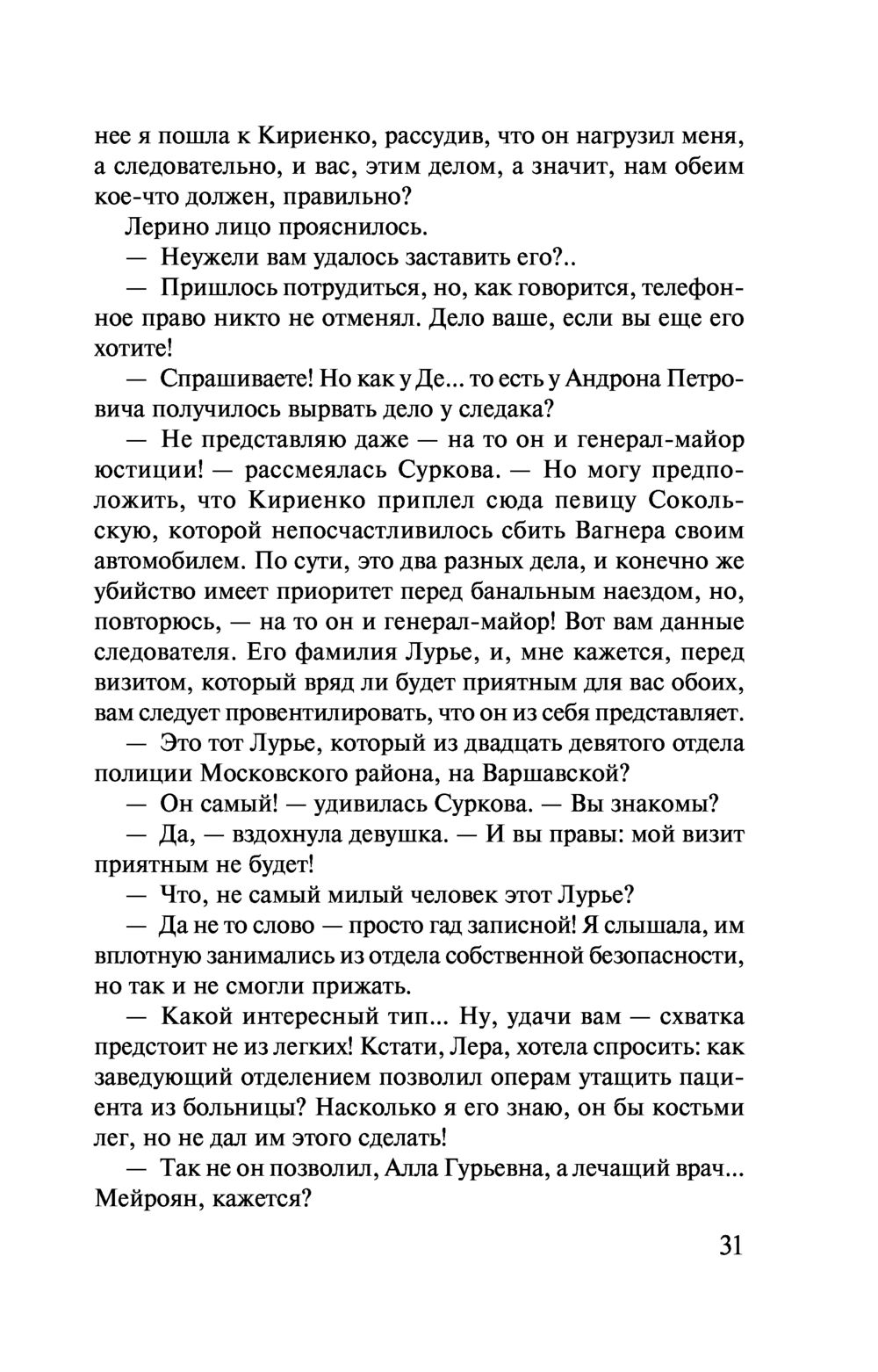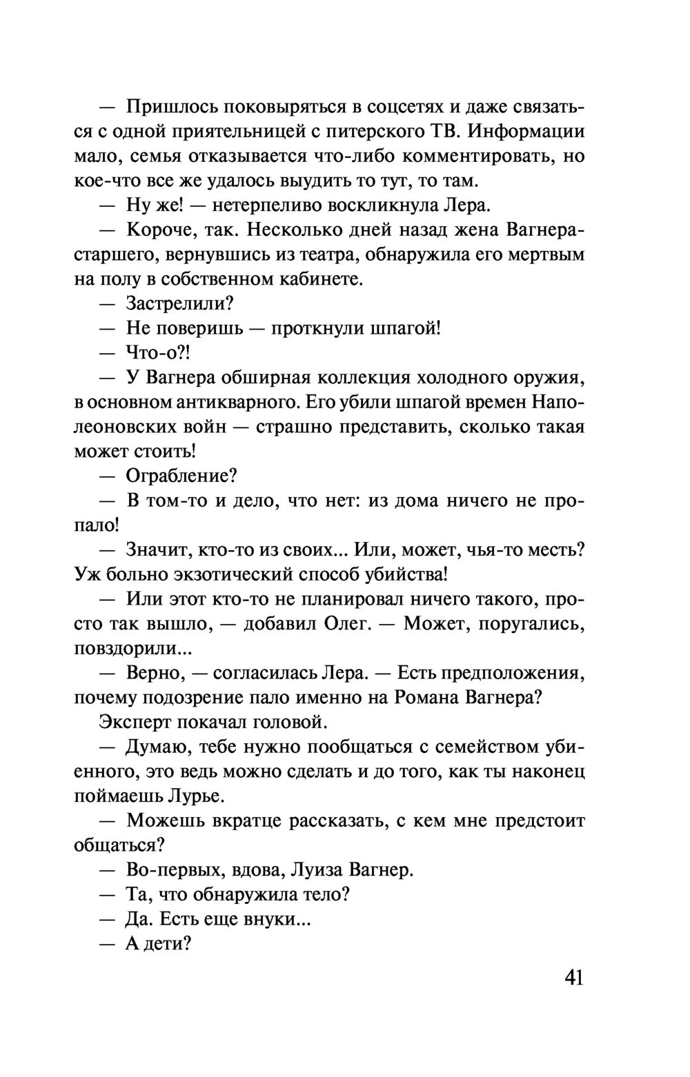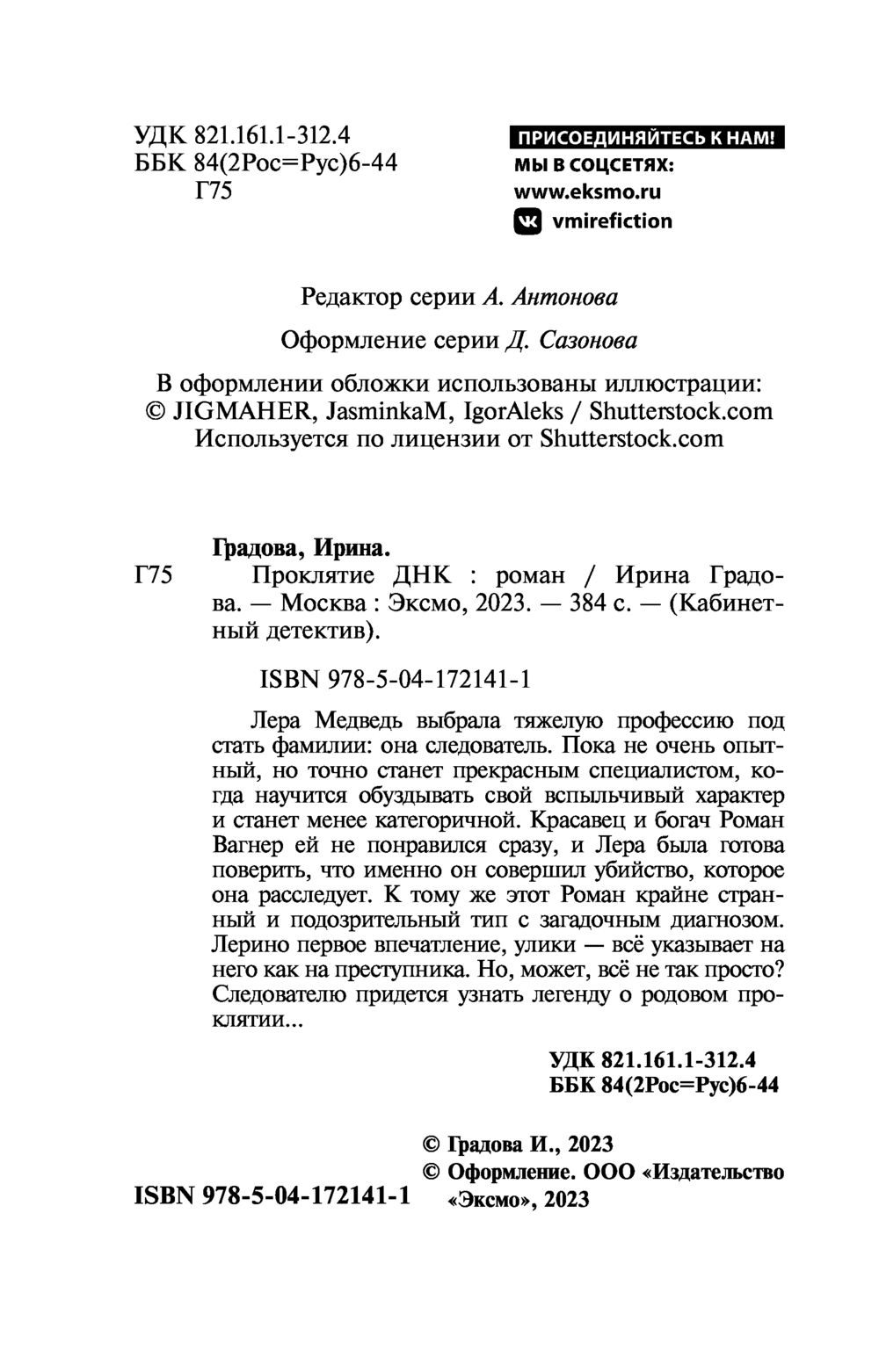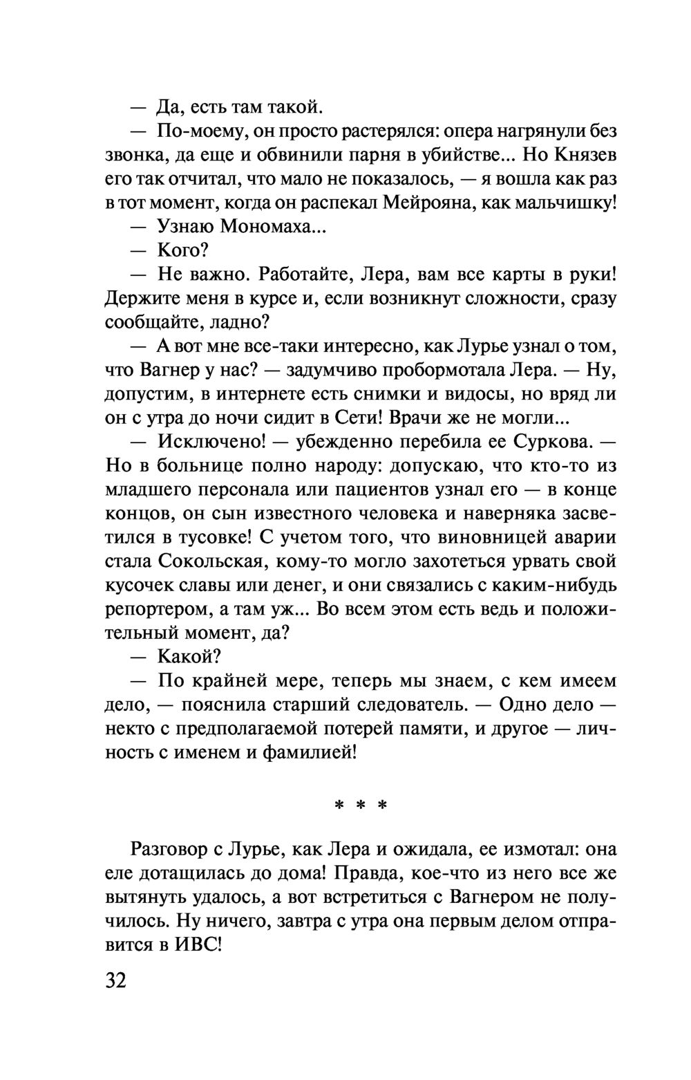 Лера Медведь выбрала тяжелую профессию под стать фамилии: она следователь. Пока не очень опытный, но точно станет прекрасным специалистом, когда научится обуздывать свой вспыльчивый характер и станет менее категоричной. Красавец и богач Роман Вагнер ей не понравился сразу, и Лера была готова поверить, что именно он совершил убийство, которое она расследует. К тому же, этот Роман крайне странный и подозрительный тип с загадочным диагнозом. Лерино первое впечатление, улики – всё указывает на него как на преступника. Но, может, всё не так просто? Следователю придется узнать легенду о родовом проклятии...