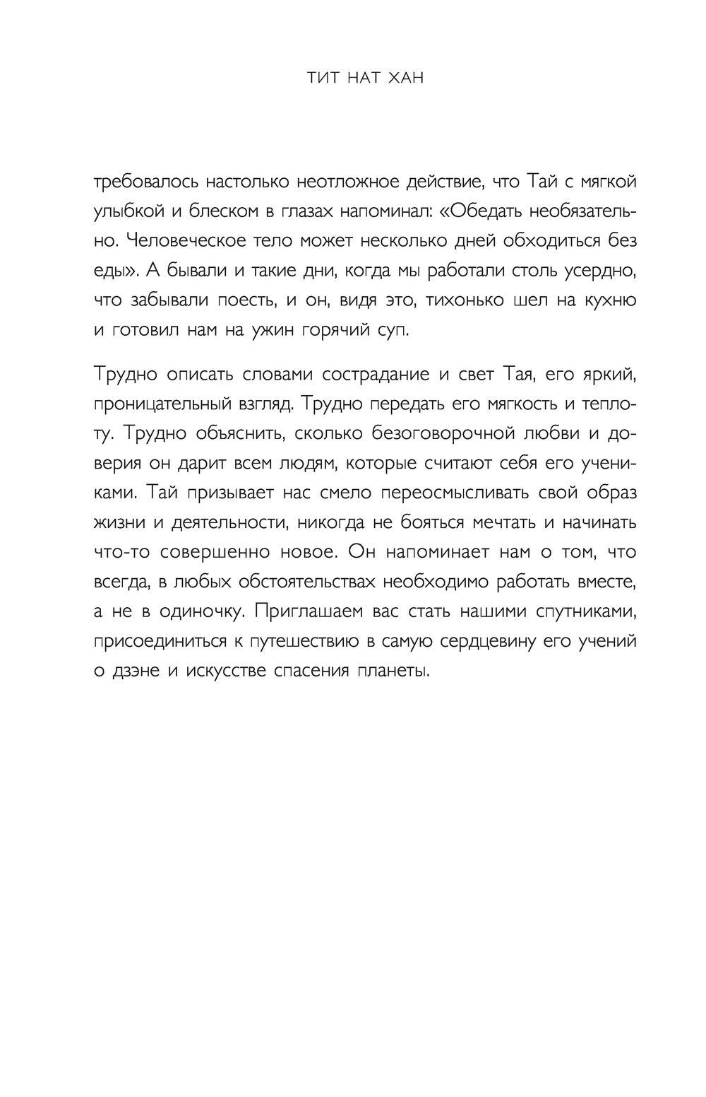 "Тай (Тит Нат Хан) учит, что практиковать медитацию значит "глубоко смотреть в самое сердце реальности и видеть то, чего не видят другие". В этой книге собраны поучения разных лет. Тай представляет практичную повседневную этику, призванную направлять наши решения и поступки, преобразовывать привычки и помогать ощущать радость и смысл в каждом моменте. Тай объясняет, что без такой этики – без духовного измерения, направляющего нашу повседневную жизнь, – мы потеряем всё". – Сестра Истинная Преданность, ученица Тит Нат Хана и соавтор книги "Дзен и искусство спасения планеты"