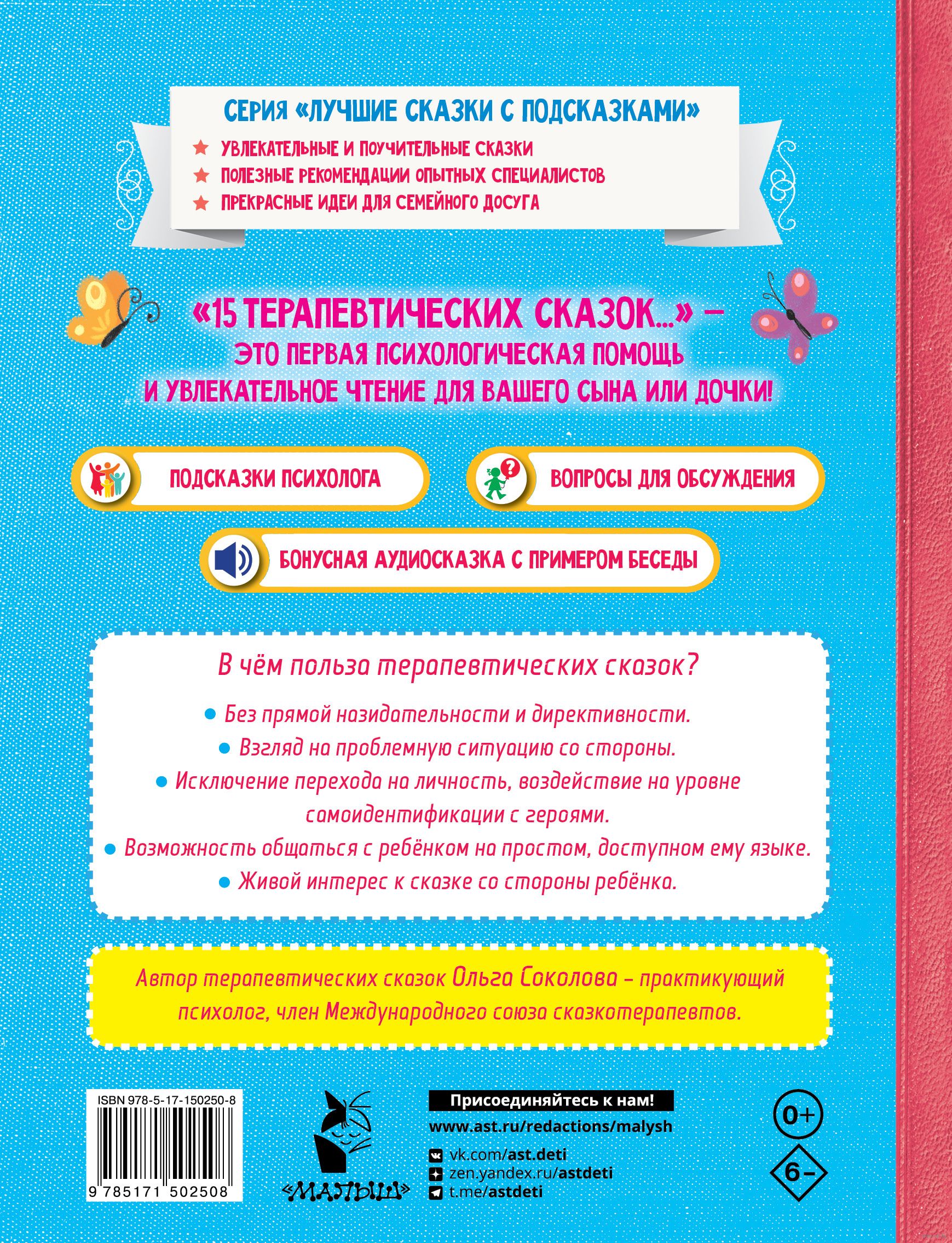 В этой книге собраны 15 сказочных историй, которые помогут вашему малышу легко и быстро справиться с различными психологическими трудностями. Все сказки написаны опытным психологом-сказкотерапевтом Ольгой Соколовой и затрагивают важные проблемы воспитания и взросления: страхи, капризы и истерики, тревожность. На примере героев сказок – милых зверят и непоседливых мальчишек и девчонок – ребята научатся поддерживать отличное настроение, понимать свои страхи и укрощать их, узнают, чем опасны капризы. Эта книга поможет вам наладить доверительные отношения со своим сыном или дочкой, лучше узнать об их затаённых обидах и страхах. Иллюстрации Анастасии Зининой украсят путешествие в страну лечебных сказок и сделают чтение ещё интереснее.