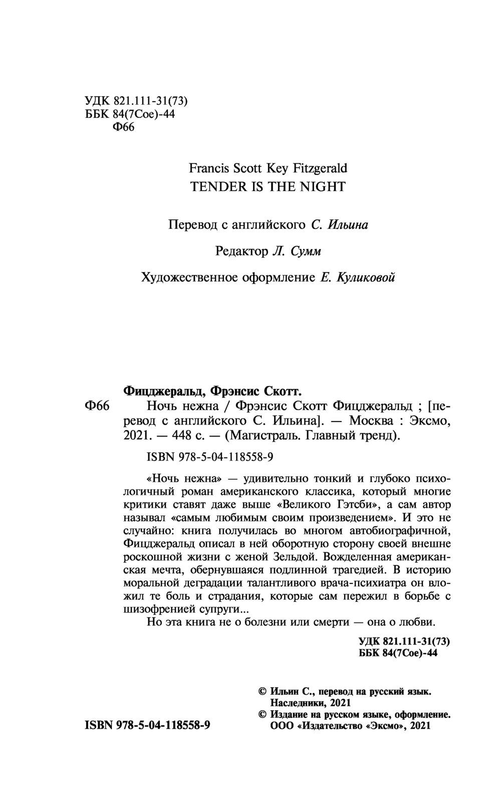 "Ночь нежна" – удивительно тонкий и глубоко психологичный роман американского классика, который многие критики ставят даже выше "Великого Гэтсби", а сам автор называл "самым любимым своим произведением". И это неслучайно: книга получилась во многом автобиографичной, Фицджеральд описал в ней оборотную сторону своей внешне роскошной жизни с женой Зельдой. Вожделенная американская мечта, обернувшаяся подлинной трагедией.