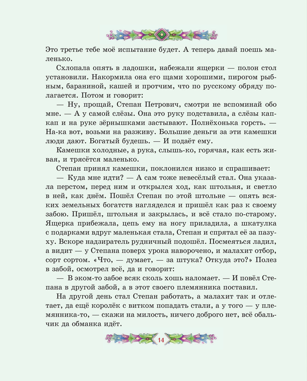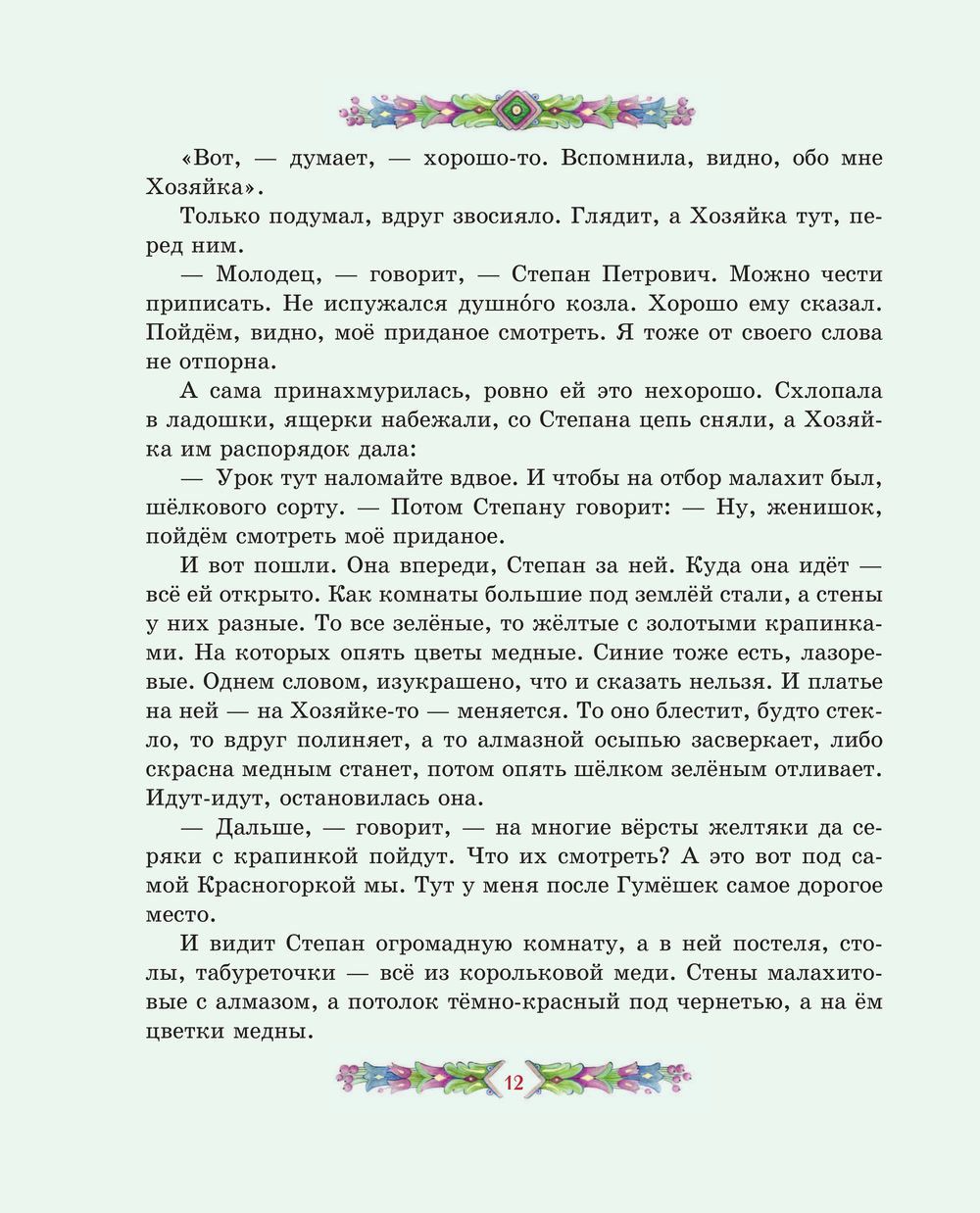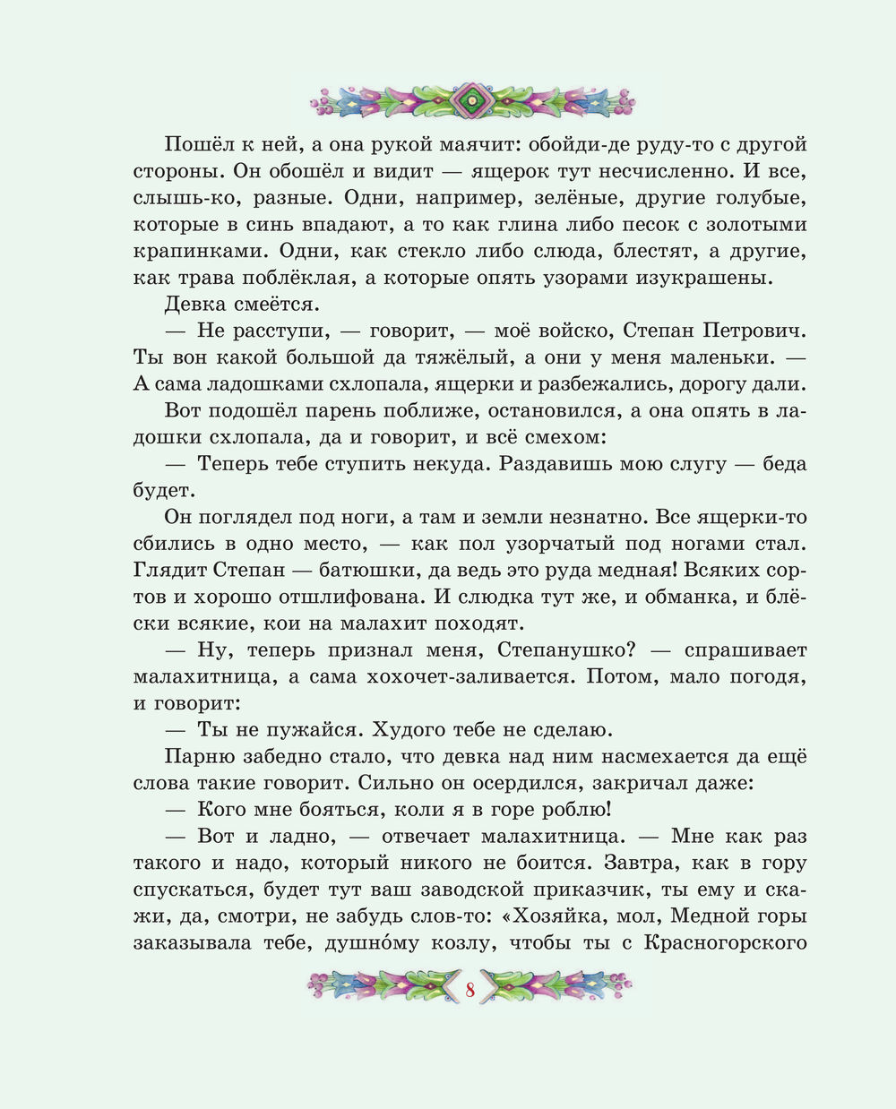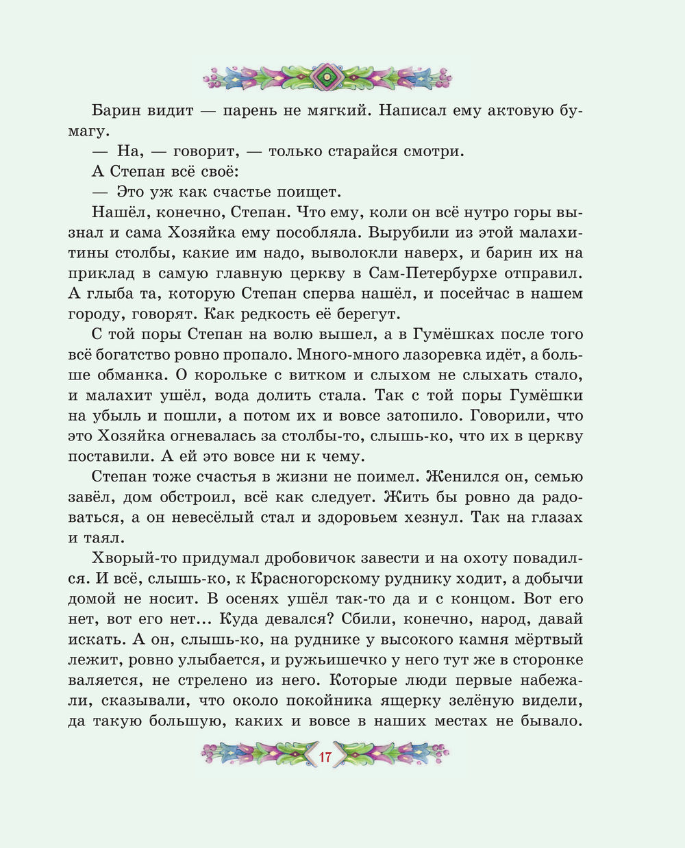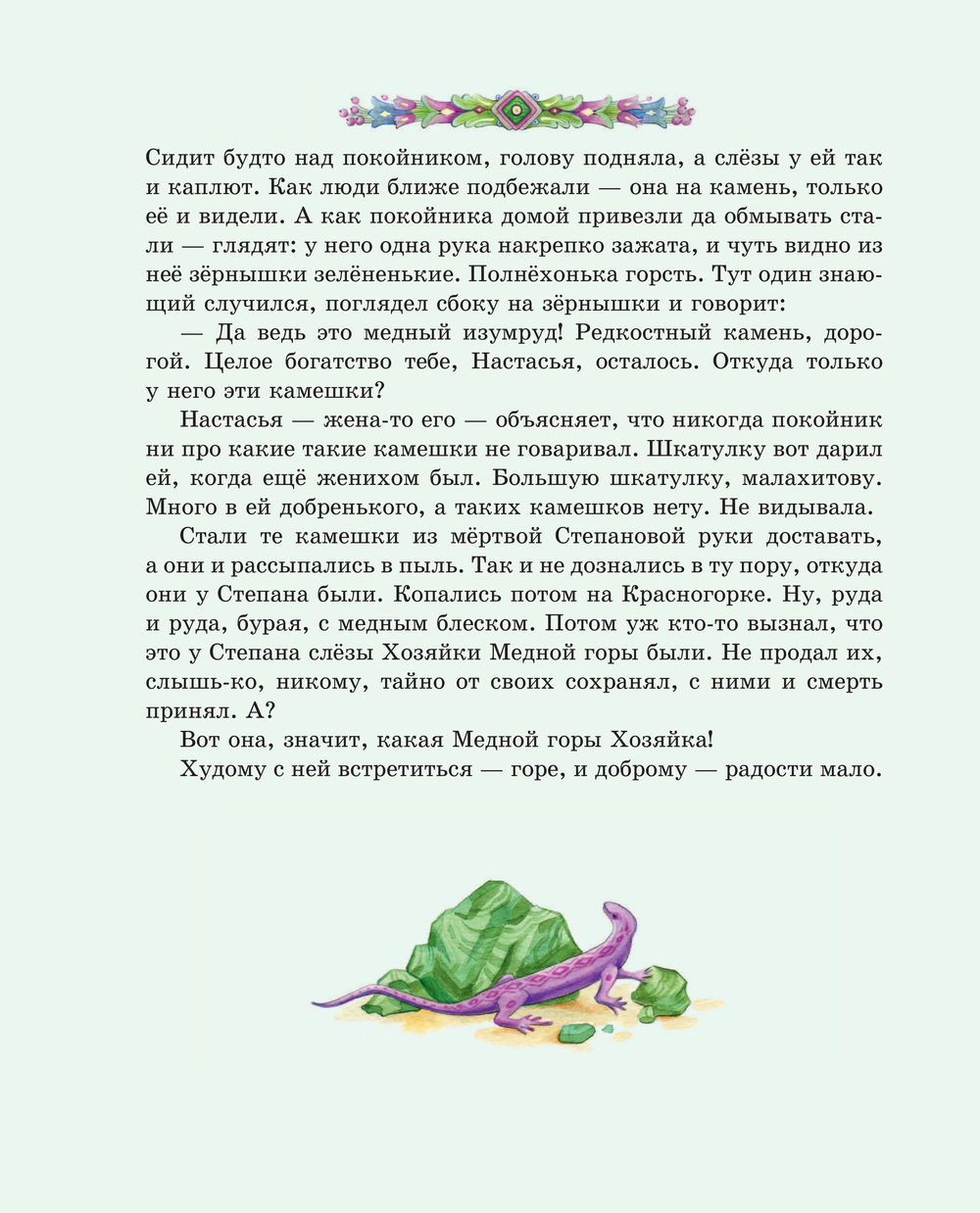 Перелистывая страницы, мы словно перебираем в руках драгоценные самоцветы: примеряем украшения из малахитовой шкатулки, отправляемся в подземное царство, мечтаем отыскать небывалый Каменный цветок. Среди десяти сказов-самоцветов непременно будет тот, что создан именно для вас. И подарит его сама Хозяйка Медной горы.