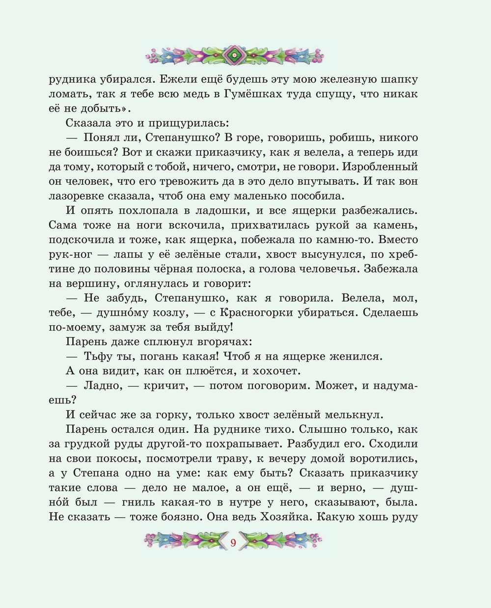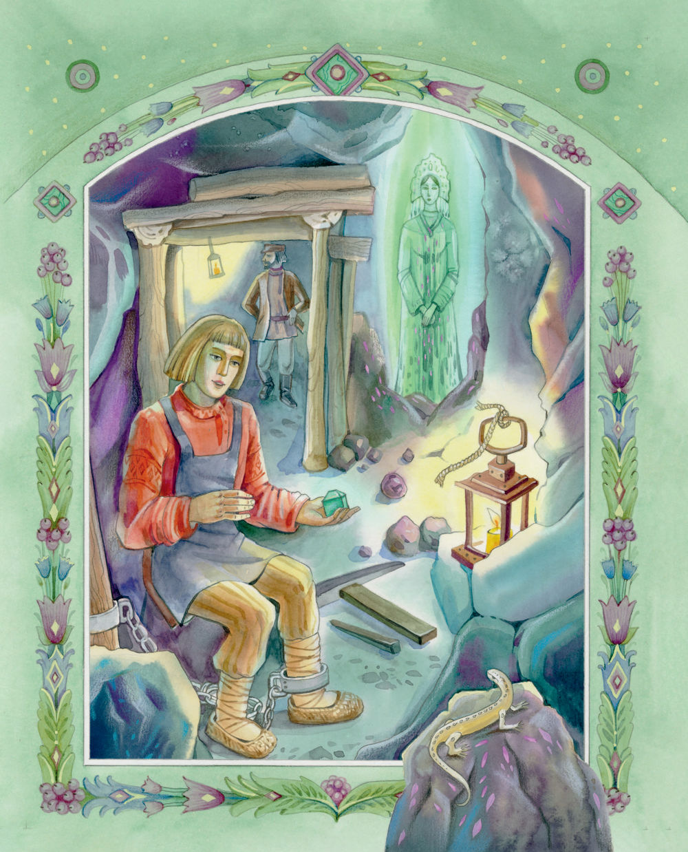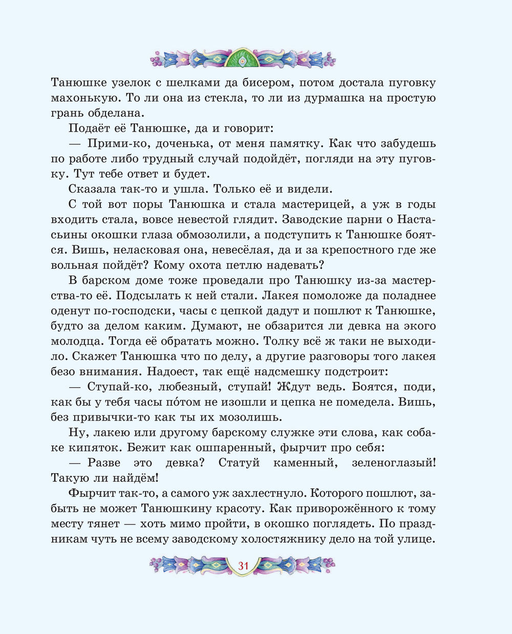 Чудесные иллюстрации современной художницы Елены Шафранской созданы в традиционном русском стиле. Они позволят заглянуть и в сказочные чертоги владычицы Уральских гор, и в волшебный каменный лес, и в барский особняк. От образов простых людей – мастеров, старателей, рабочих – словно веет настоящим, живым теплом. А Хозяйка является в разных обличьях, но всякий раз её несложно узнать.