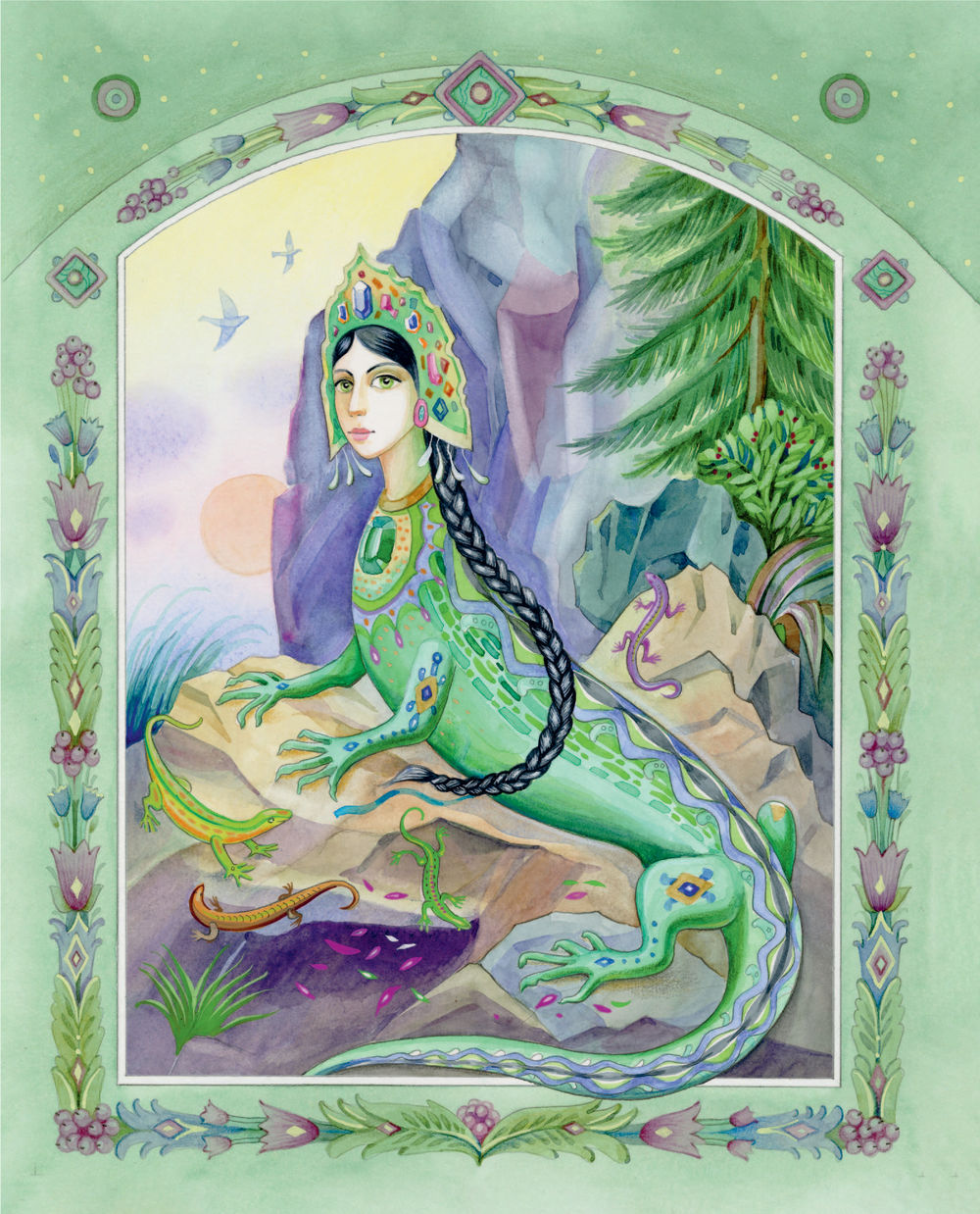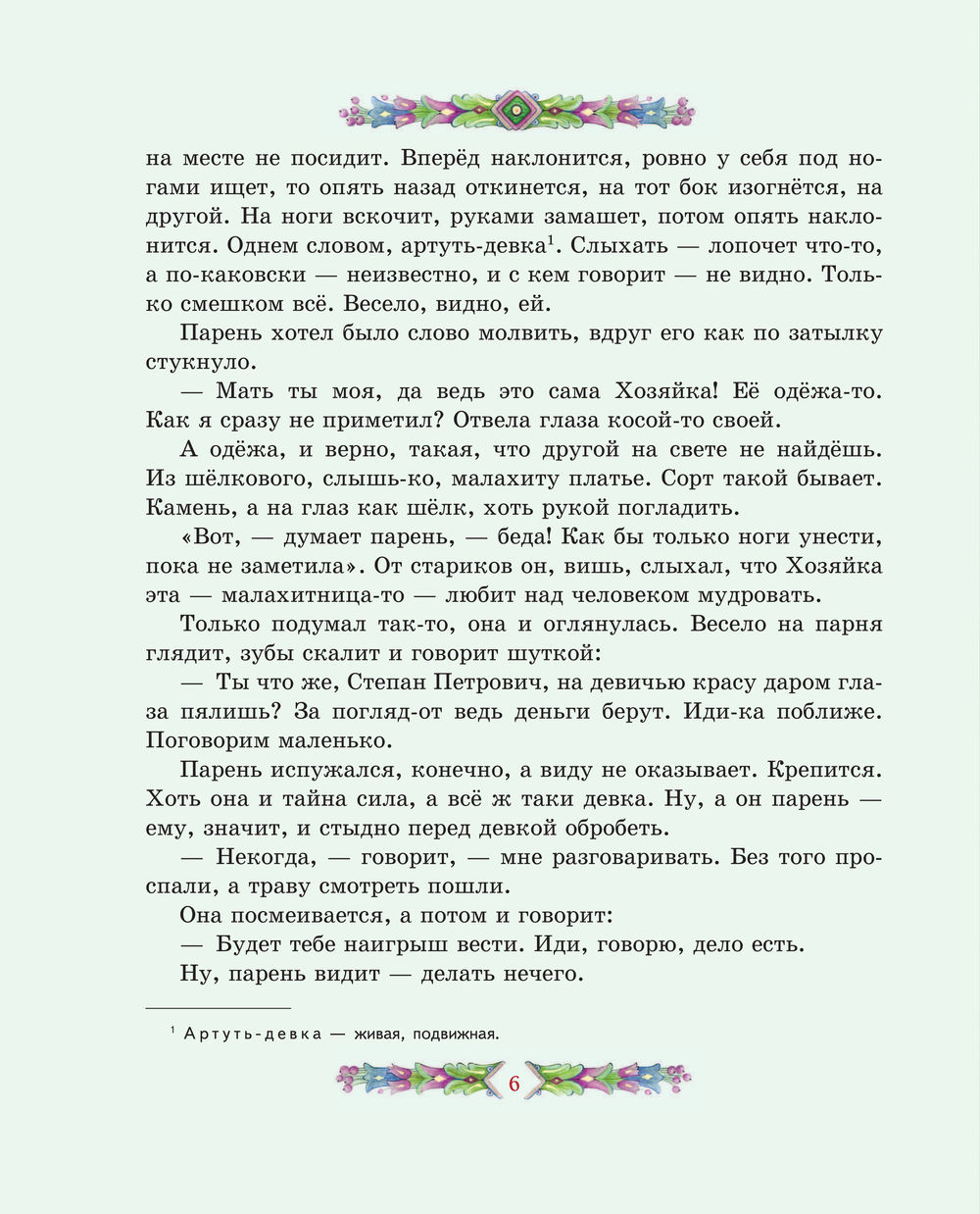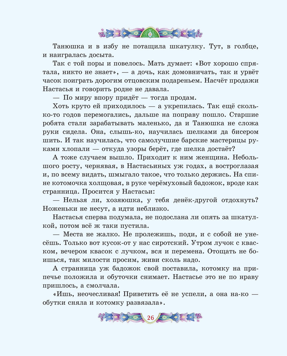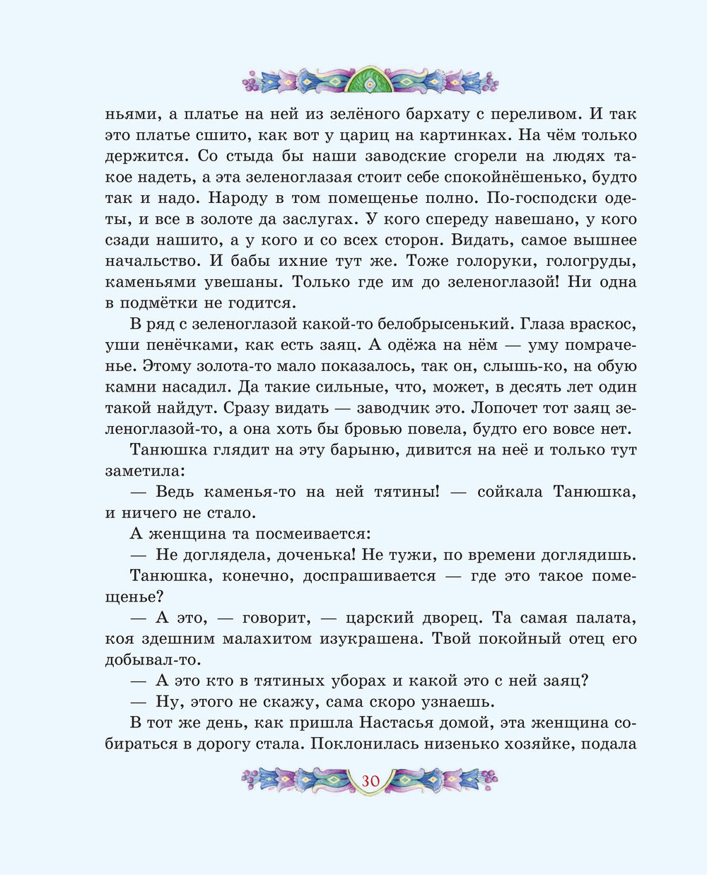 Чудесные иллюстрации современной художницы Елены Шафранской созданы в традиционном русском стиле. Они позволят заглянуть и в сказочные чертоги владычицы Уральских гор, и в волшебный каменный лес, и в барский особняк. От образов простых людей – мастеров, старателей, рабочих – словно веет настоящим, живым теплом. А Хозяйка является в разных обличьях, но всякий раз её несложно узнать.