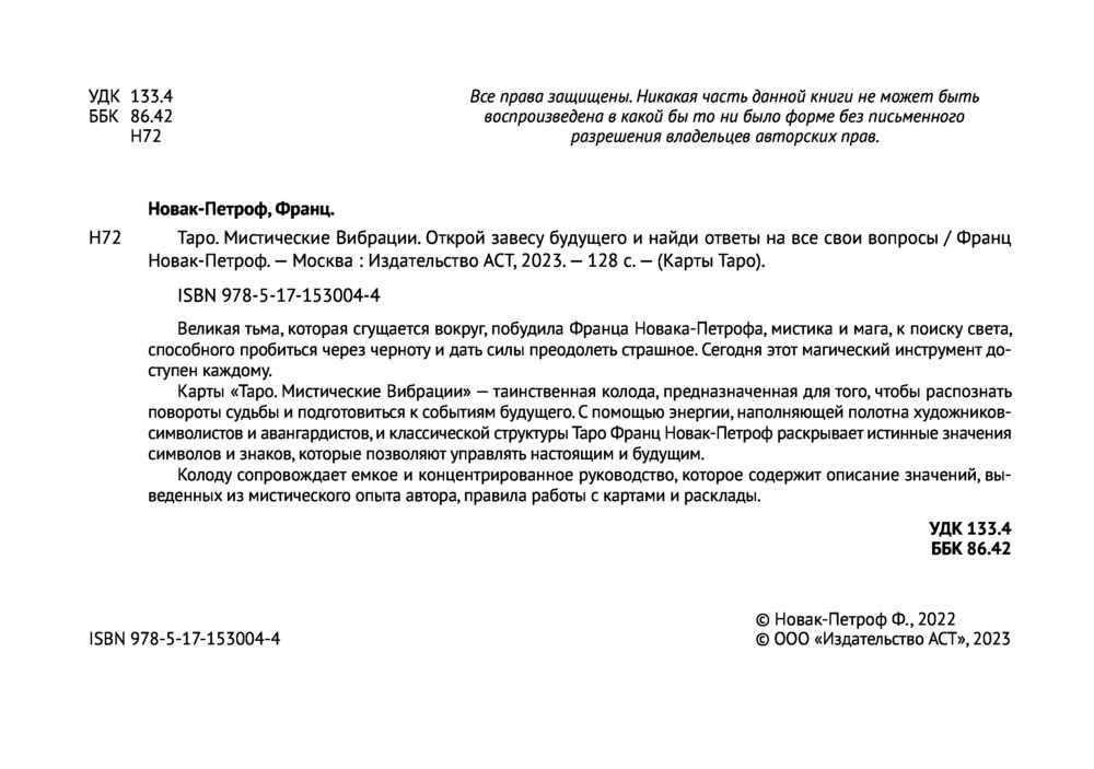 Карты "Таро. Мистические Вибрации" – таинственная колода, предназначенная для того, чтобы распознать повороты судьбы и подготовиться к событиям будущего. С помощью энергии и таланта художников прошлого и классической структуры Таро маг и мистик Франц Новак-Петроф предлагает вам соединить свое бессознательное "я" с символическим описанием прошлого и будущего в полотнах символистов и авангардистов.