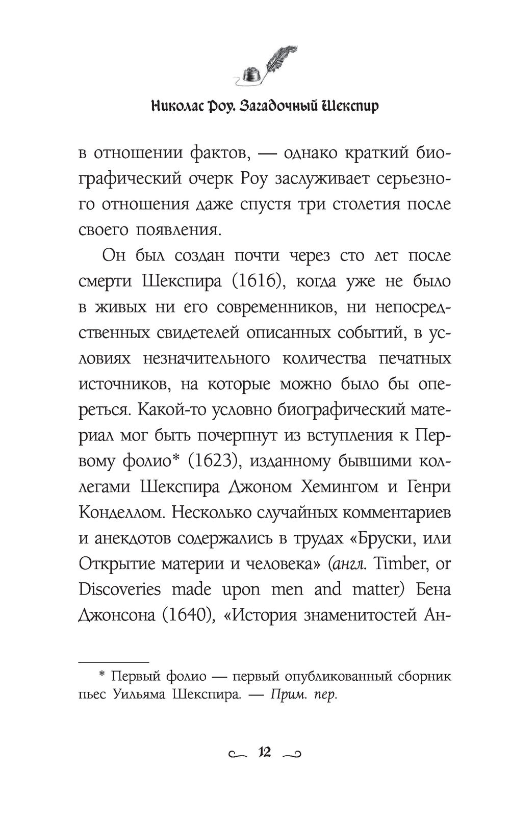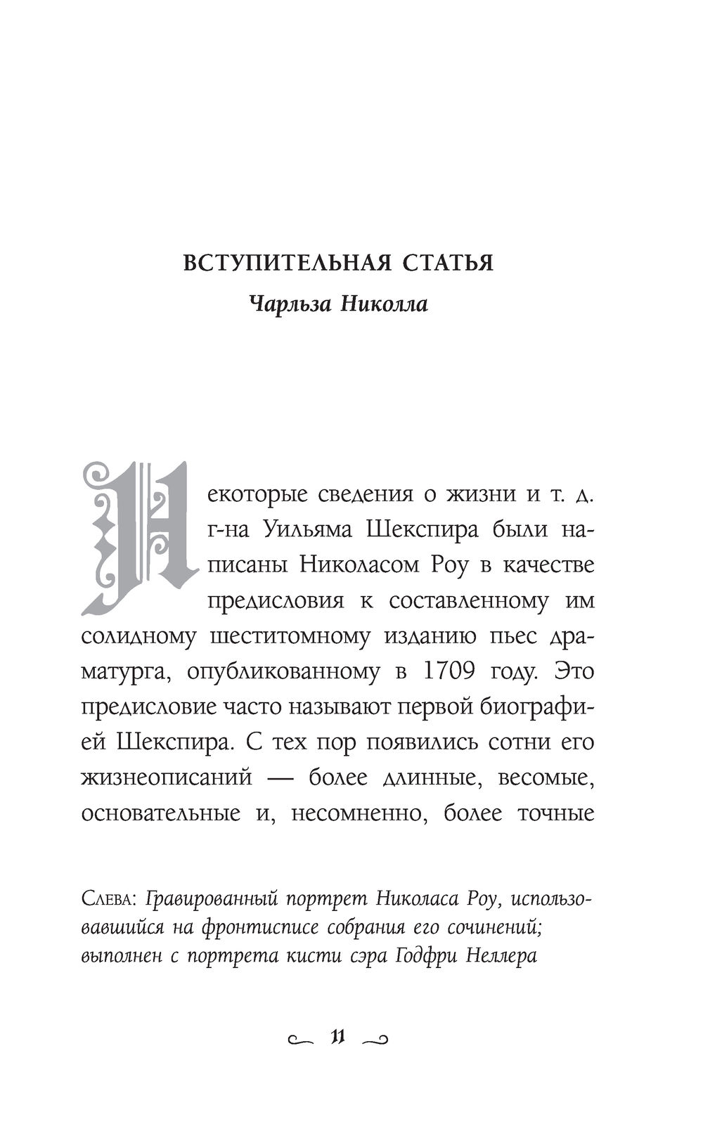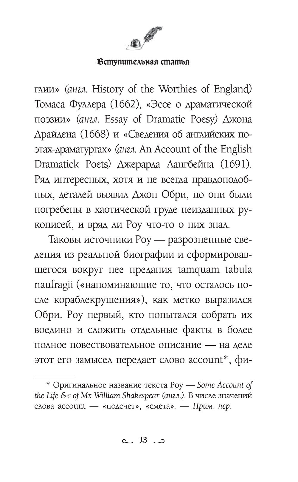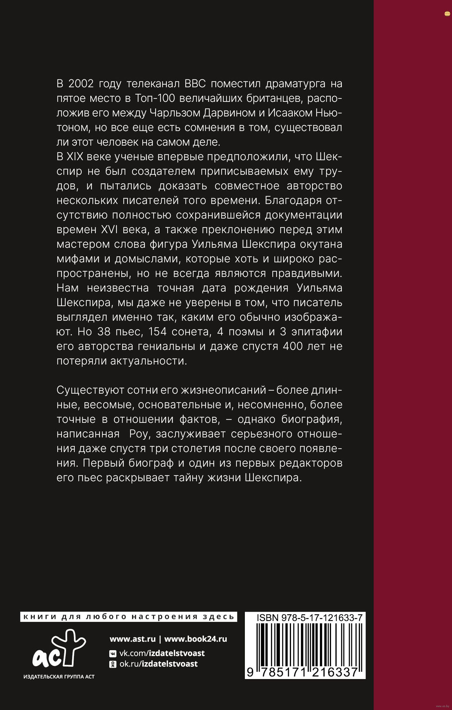 В XIX веке ученые впервые предположили, что Шекспир не был создателем предписываемых ему трудов, и пытались доказать совместное авторство нескольких писателей того времени. Благодаря отсутствию полностью сохранившейся документации времен XVI века, а также преклонению перед этим мастером слова, фигура Уильяма Шекспира окутана мифами и домыслами, которые хоть и широко распространены, но не всегда являются правдивыми. Существуют сотни его жизнеописаний – более длинные, весомые, основательные и, несомненно, более точные в отношении фактов, – однако биография, написанная Роу заслуживает серьезного отношения даже спустя три столетия после своего появления. Первый биограф и один из первых редакторов его пьес раскрывает тайну жизни Шекспира.