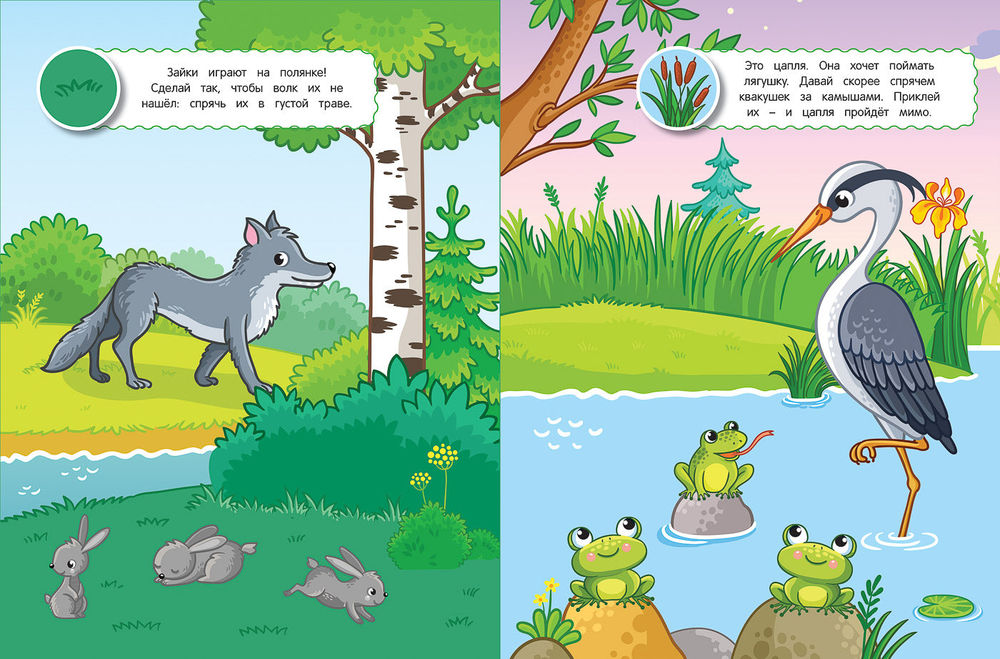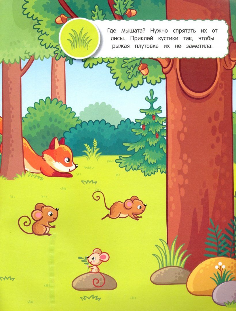 В этой книжке всё наоборот. Наклейками нужно не дополнять картинку, а использовать их, чтобы спрятать имеющихся персонажей. Как работать с этой книгой? Внимательно рассмотрите с малышом картинку, прочитайте задание и выберите подходящие наклейки, которые помогут задание выполнить. Пряча под наклейкой персонажа, малыш учится приклеивать аккуратно.