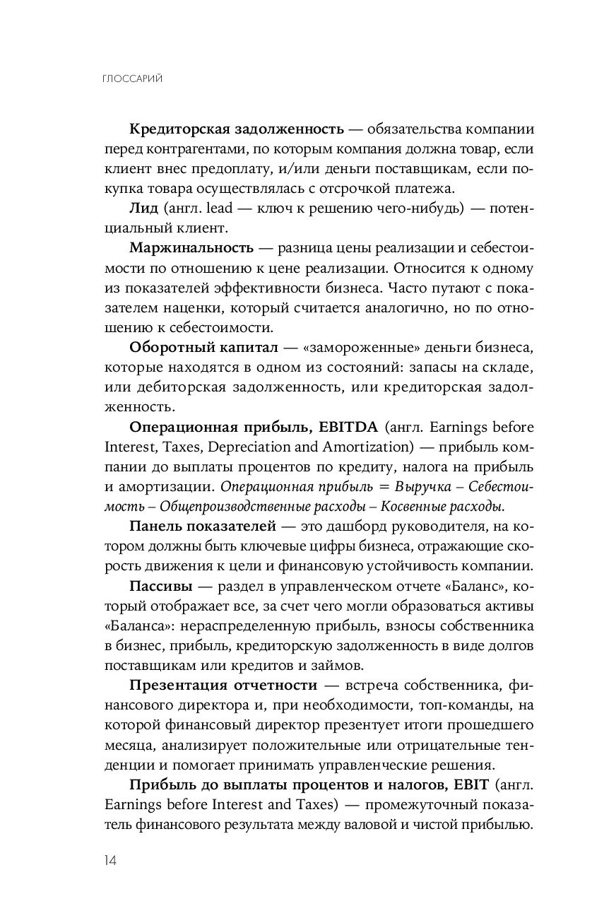 Екатерина Матвеева, профи в области построения системы управленческого учёта и внедрения систем управления в компаниях, делает детальный разбор показателей, за которыми нужно следить, даёт инструкцию по подготовке отчётов, рассказывает о том, как внедрить инструменты планирования и как вовлечь сотрудников в процесс достижения финансовых целей. В каждой главе описаны наиболее важные блоки отчётности, которые позволяют строго контролировать этапы управления.