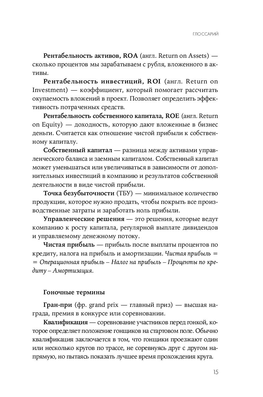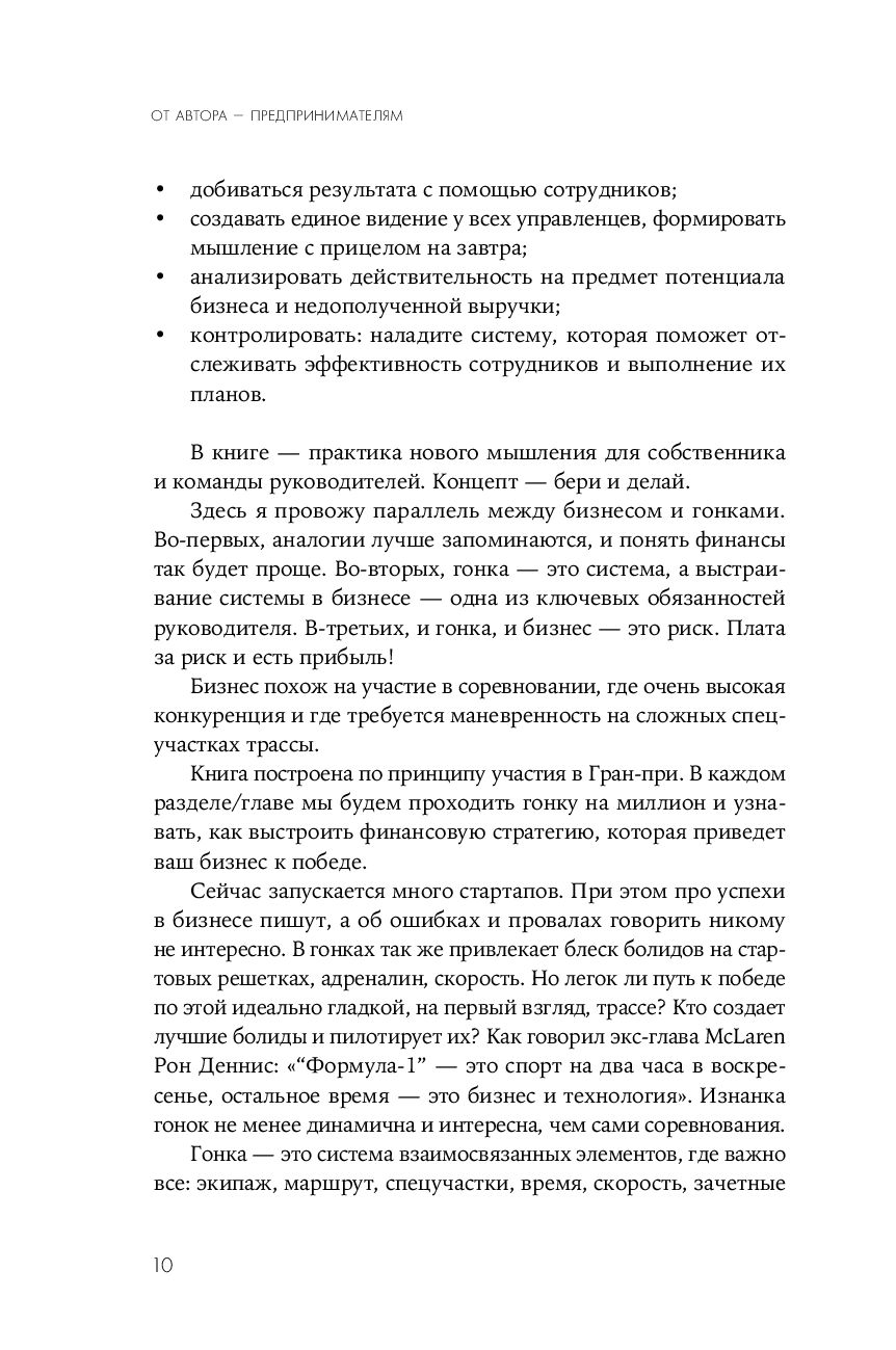 Несмотря на всю серьёзность информации, книга написана легко и предельно понятно, а образное и точное сравнение разработки финансовой стратегии с гонками за гран-при добавляет книге динамичности и занимательности.