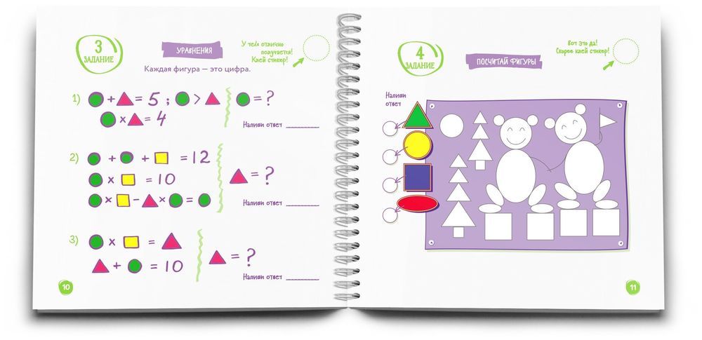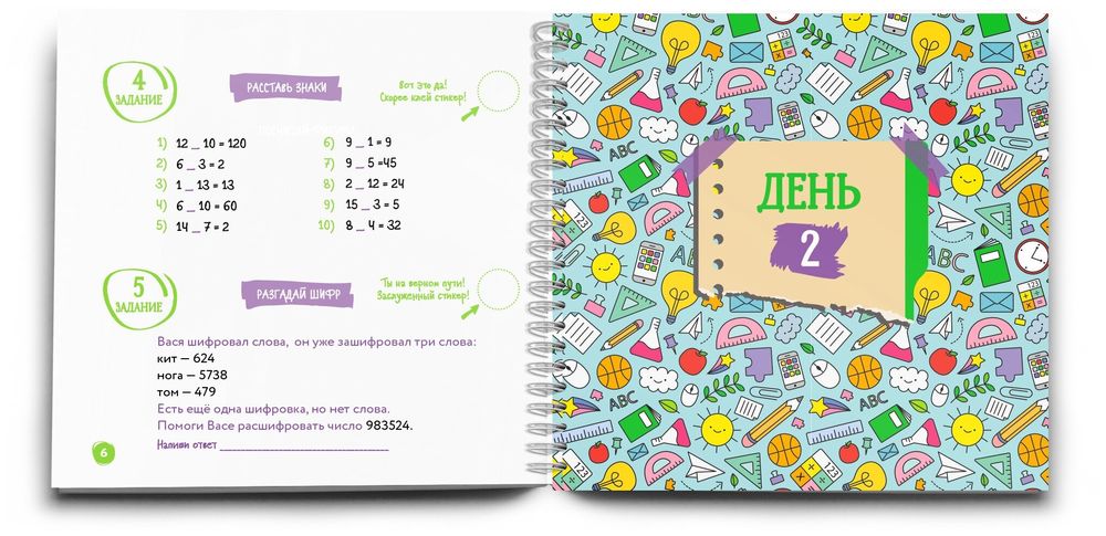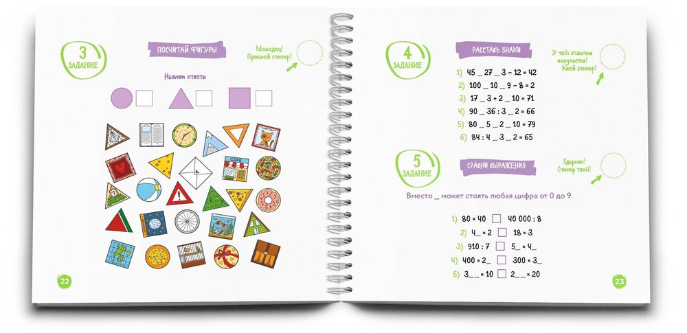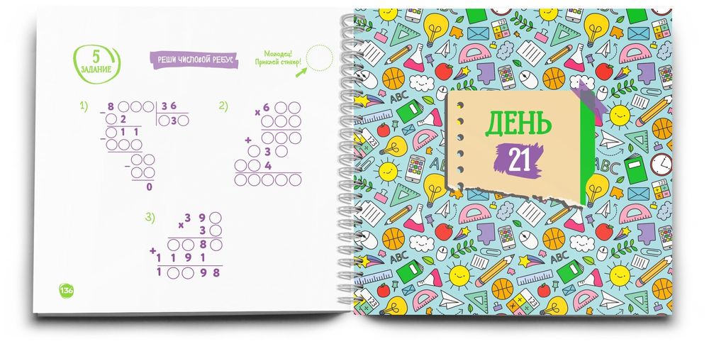 21 урок по 20-30 минут познакомят ребенка с принципами этих арифметических действий, а также с хитростями, которые позволят упростить вычисления. За каждое выполненное задание и пройденный день ребенок получает стикеры. А в конце блокнота предусмотрена карта достижений, с помощью которой он сможет следить за своими успехами.