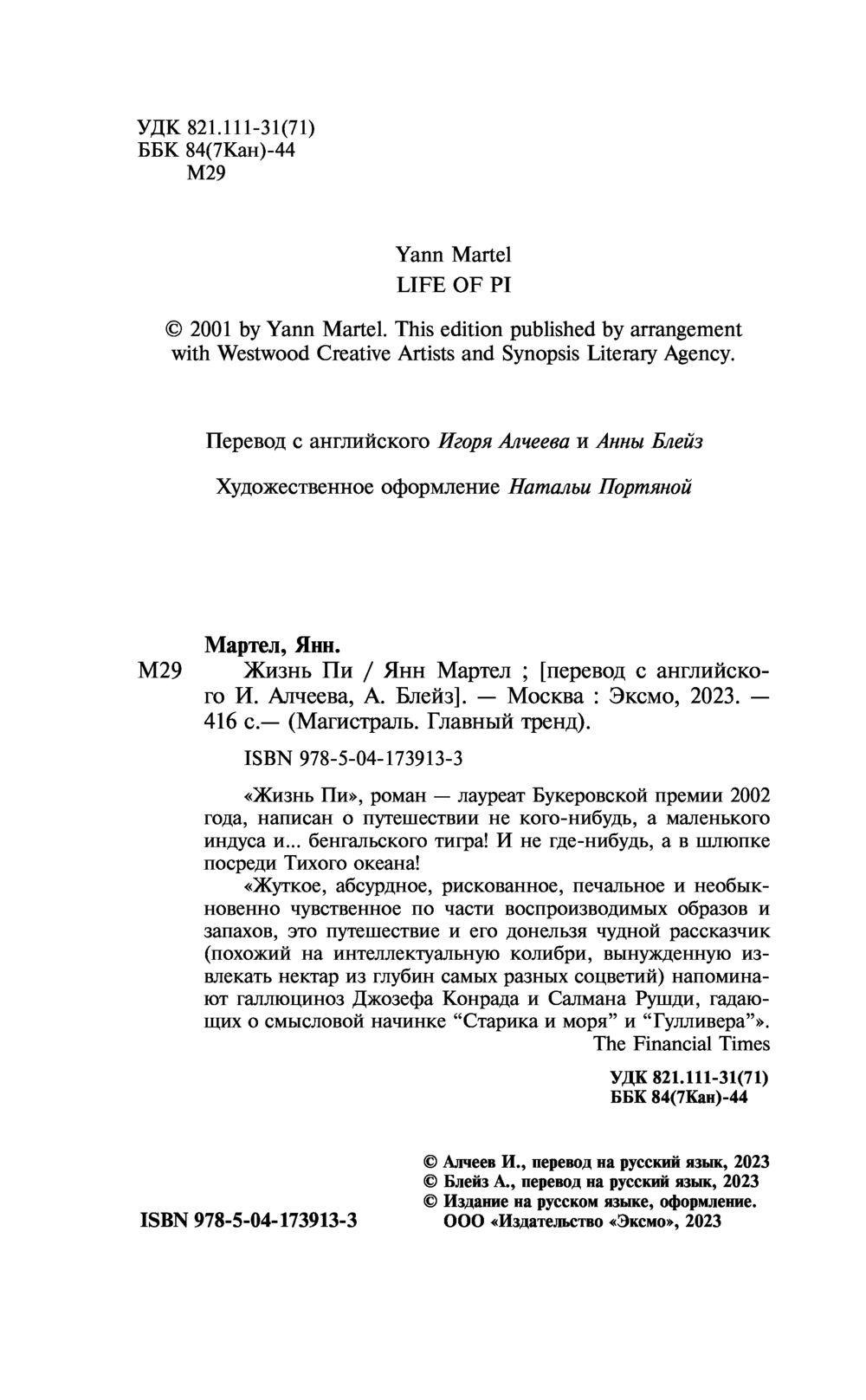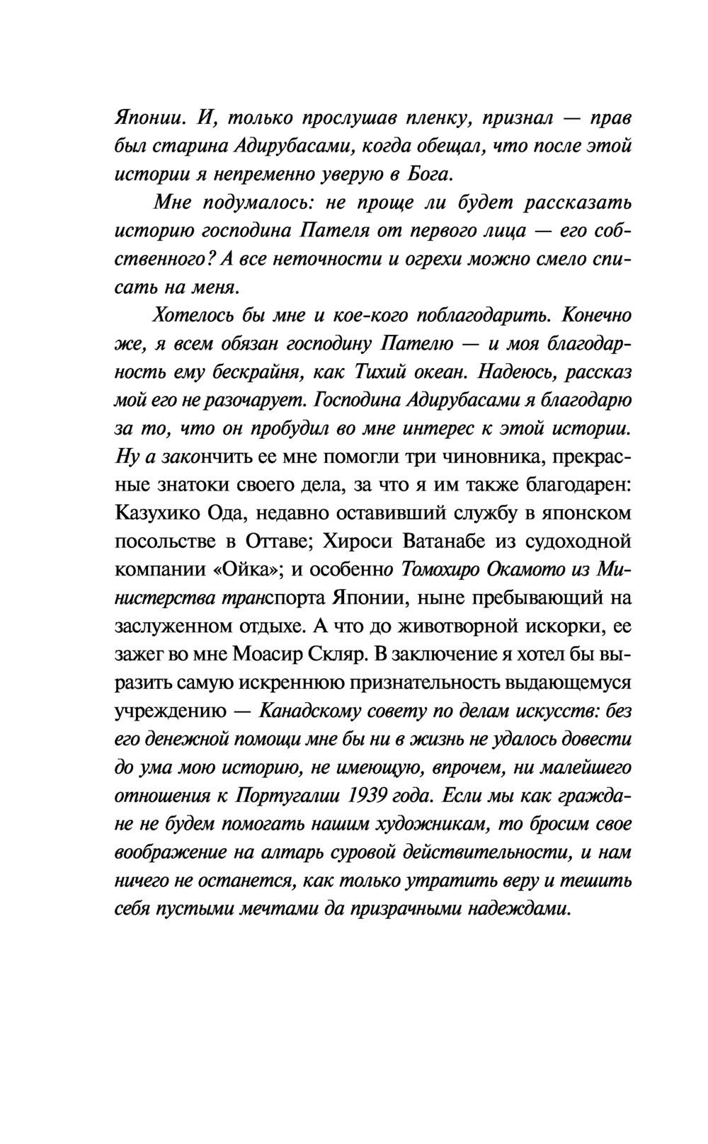 "Жизнь Пи" произвела настоящий культурный взрыв в мировой интеллектуальной среде. Фантастическое путешествие юноши и бенгальского тигра, описанное в романе, перекликается с повестью "Старик и море", с магическим реализмом Маркеса и с абсурдностью Беккета. Книга стала не только бестселлером, но и символом литературы нового века, флагом новой культуры.