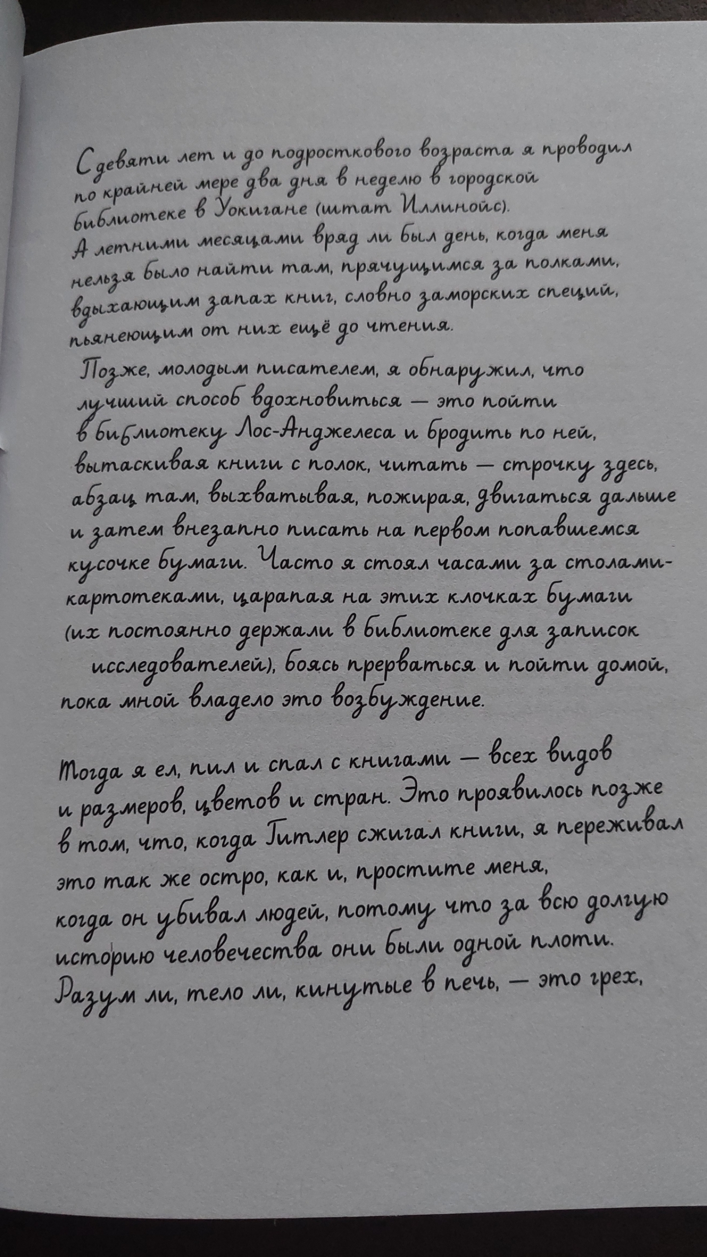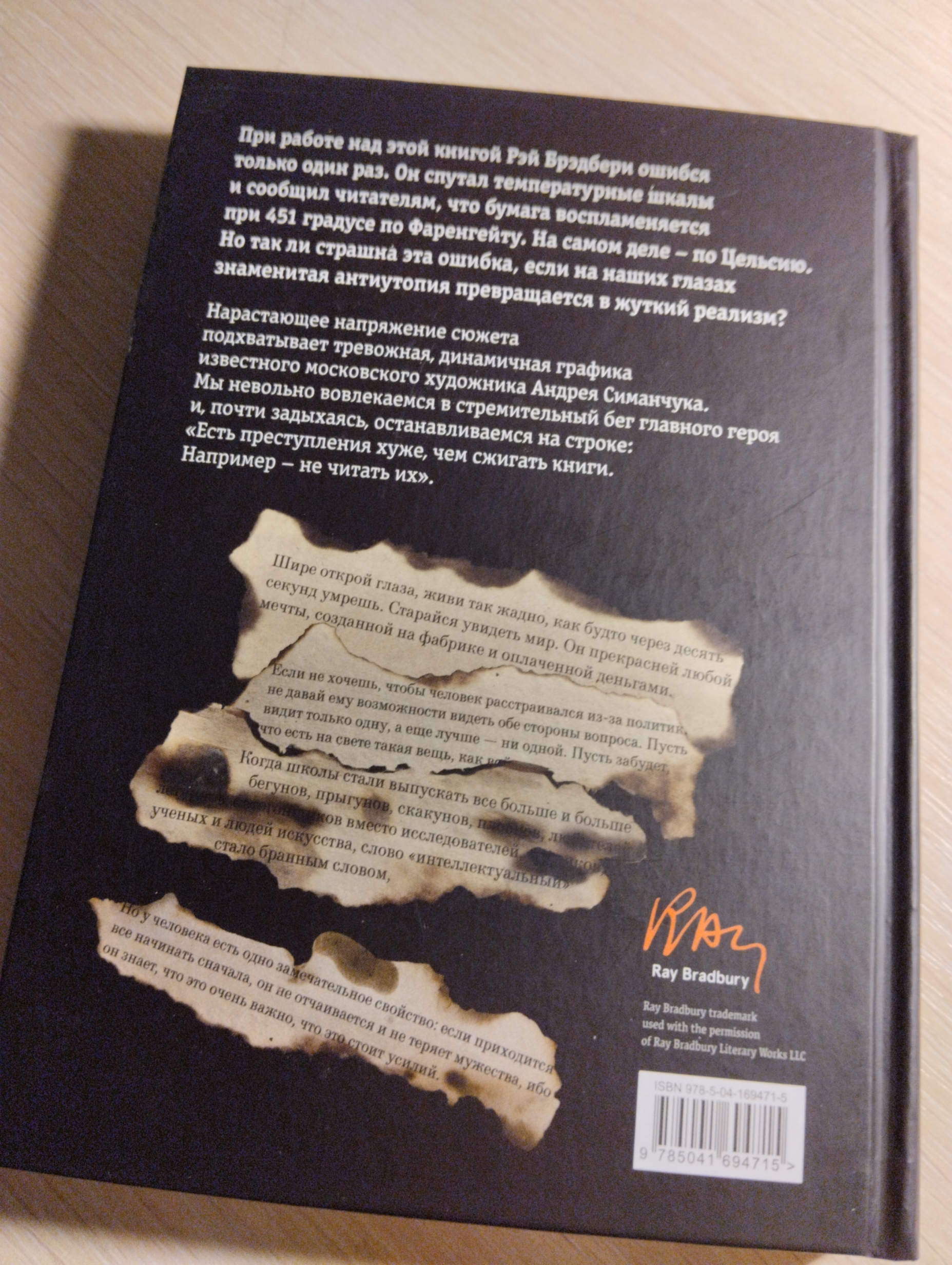 Просто потрясающая книга! Прочитала за вечер, а думаю до сих пор... Телевизионные стены, равнодушие и черствость друг к другу, нежелание думать... Брэдбери как в воду смотрел! И в отличие от другой популярной антиутопии - "1984", книга не навевает тоску, а дает надежду на лучшее.