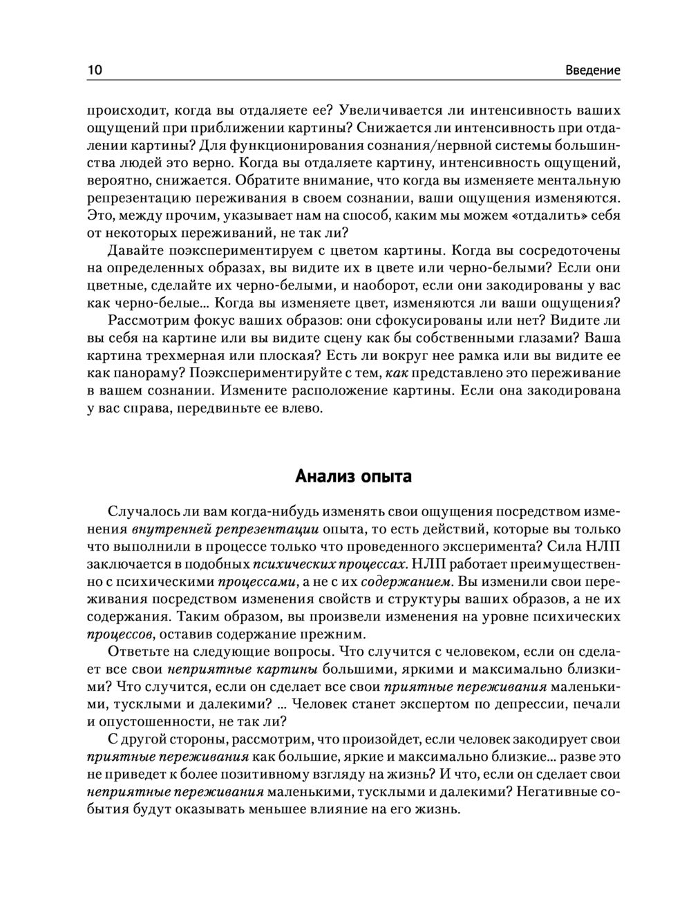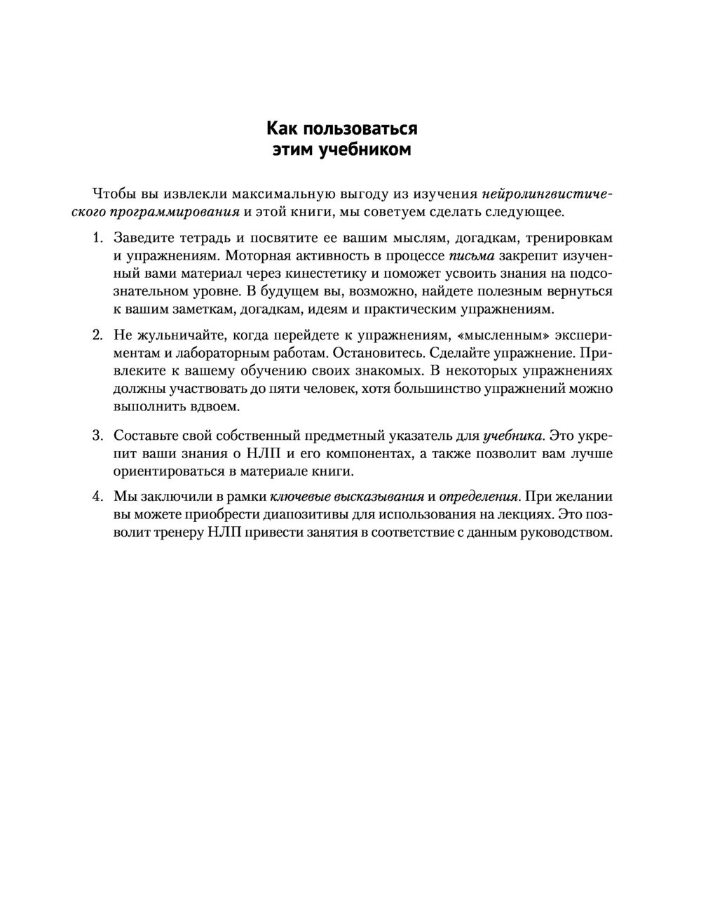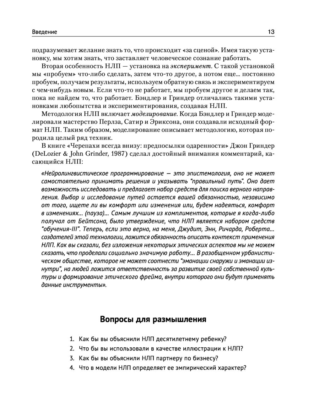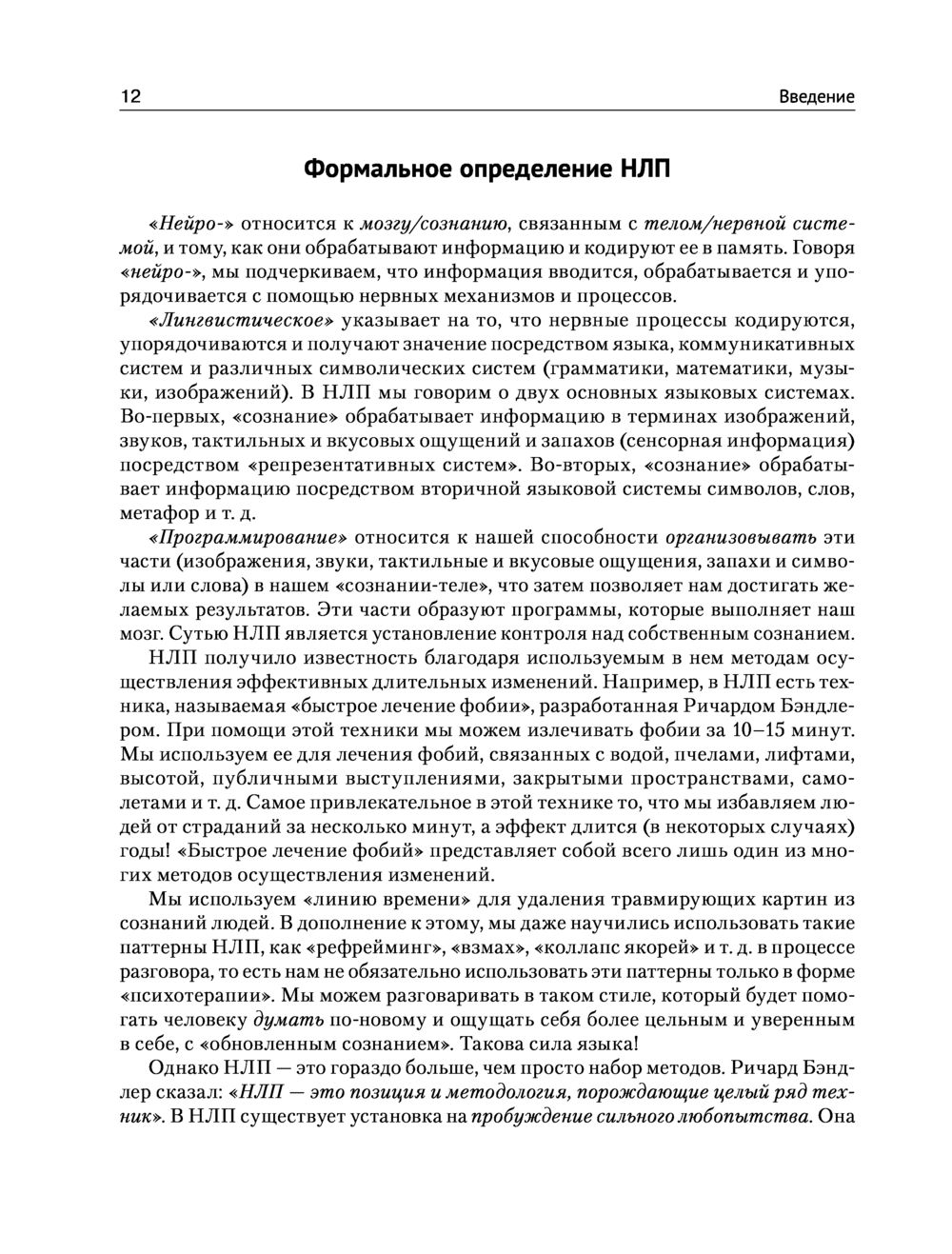 Отлично структурированное и профессионально организованное, отличающееся широким набором упражнений и методов, способствующих надежному усвоению материала, издание предоставляет читателю превосходную возможность получить все лучшее из НЛП как для удовлетворения первого любопытства, так и для повышения своей профессиональной квалификации и компетенции.
