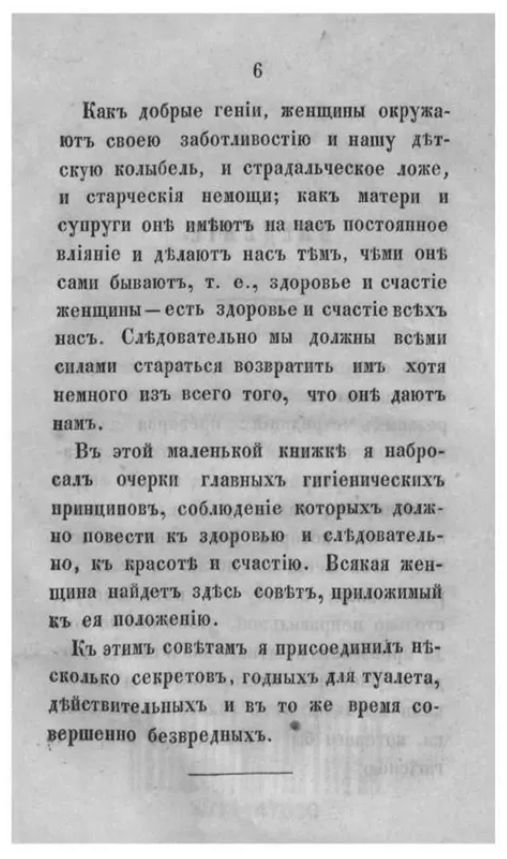 В начале прошлого века считалось, что женщина подвержены тысячам физических и моральных страданий. В этой маленькой книжке находятся очерки главных гигиенических принципов, соблюдение которых должно повести к здоровью и, следовательно, к красоте и счастью. Всякая женщина найдет здесь советы, приложимые к ее положению.