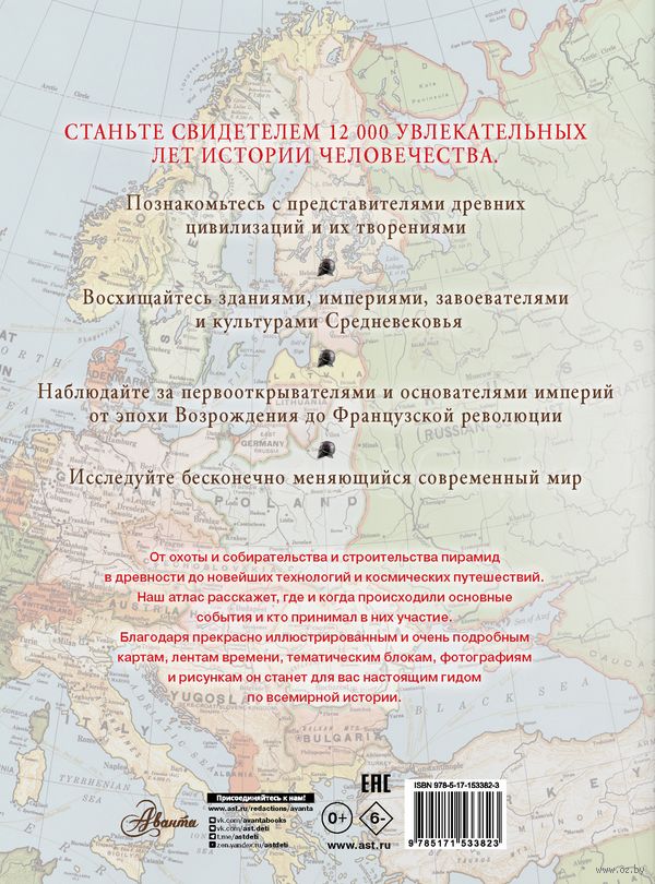 Этот атлас – настоящий гид по всемирной истории. Благодаря прекрасно иллюстрированным, подробным картам, лентам времени по каждому периоду, тематическим блокам, фотографиям и рисункам вы будете перемещаться во времени и пространстве: от древнейших цивилизаций до современных государств, из Новой Зеландии в Африку и на Аляску.