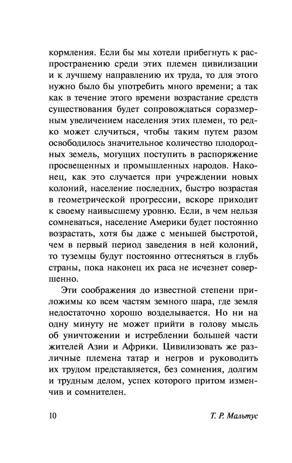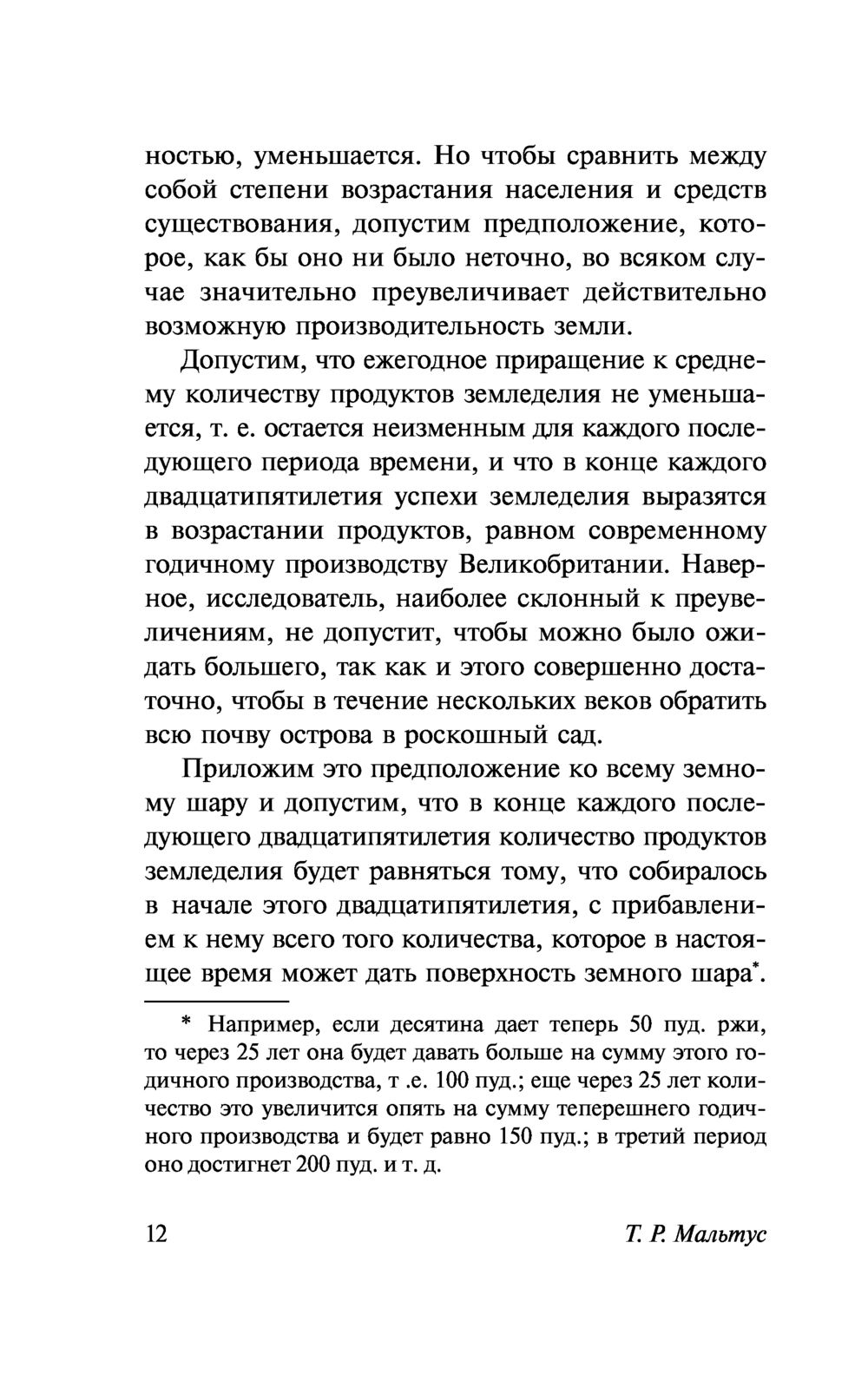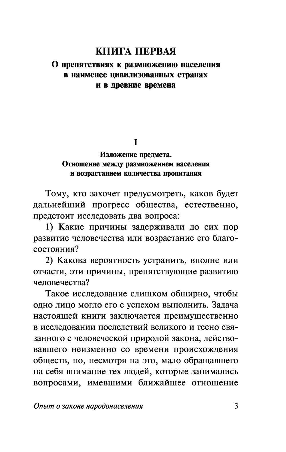 В книге "Опыт закона о народонаселении" Мальтус писал, что если рост населения не задерживается какими-либо причинами, то население будет удваиваться каждые четверть века, и, следовательно, возрастать в геометрической прогрессии. В силу ограниченности ресурсов это неизбежно приведёт к бедности, голоду и социальным потрясениям. Идеи Мальтуса отвергали и ниспровергали многие, в том числе и классики марксизма. Но позже вновь и вновь экономисты возвращались к выводам Мальтуса. Его взгляды, несмотря ни на что, остаются актуальными до сих пор, особенно в свете "зеленой повестки".
