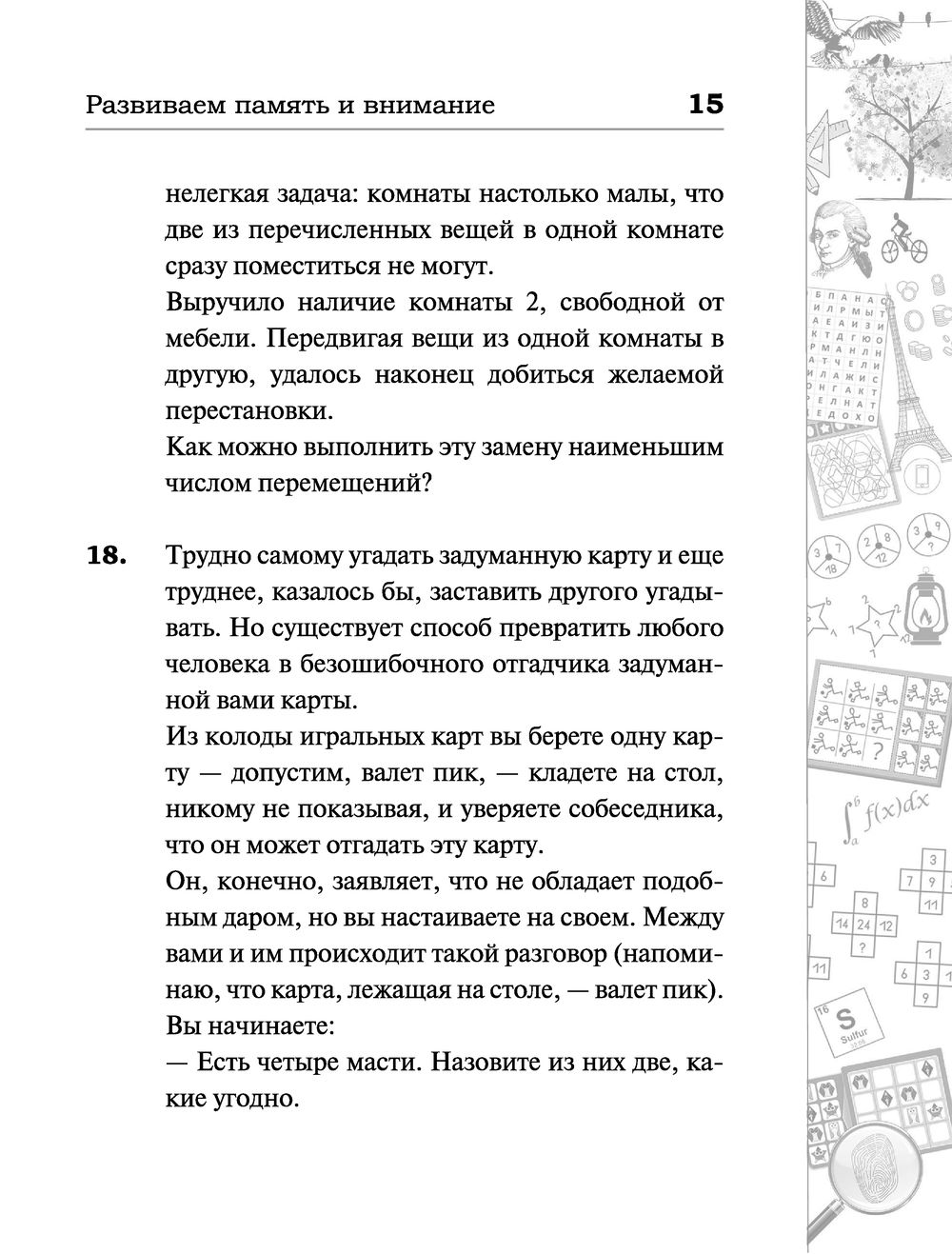 Решая задачи из этого сборника, вы разовьете память, наблюдательность и пространственное мышление, отточите интеллект и повысите эрудицию, расширите свой кругозор и улучшите способности к концентрации внимания и запоминанию деталей. Даже сможете представить себя детективом и на деле применить дедуктивный метод.