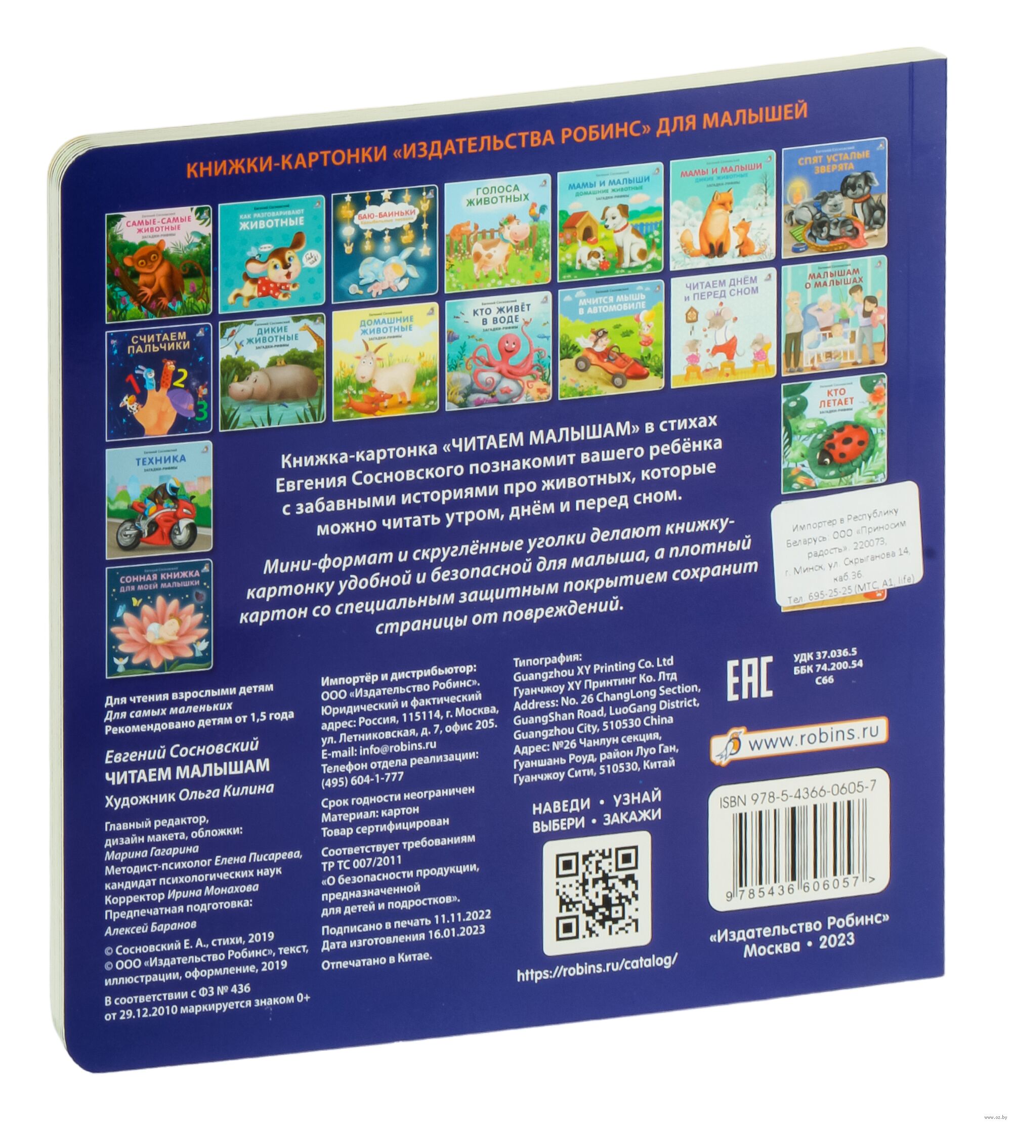 Книжка-картонка «Читаем малышам» в стихах Евгения Сосновского познакомит вашего ребёнка с забавными историями про животных, которые можно читать утром, днём и перед сном.