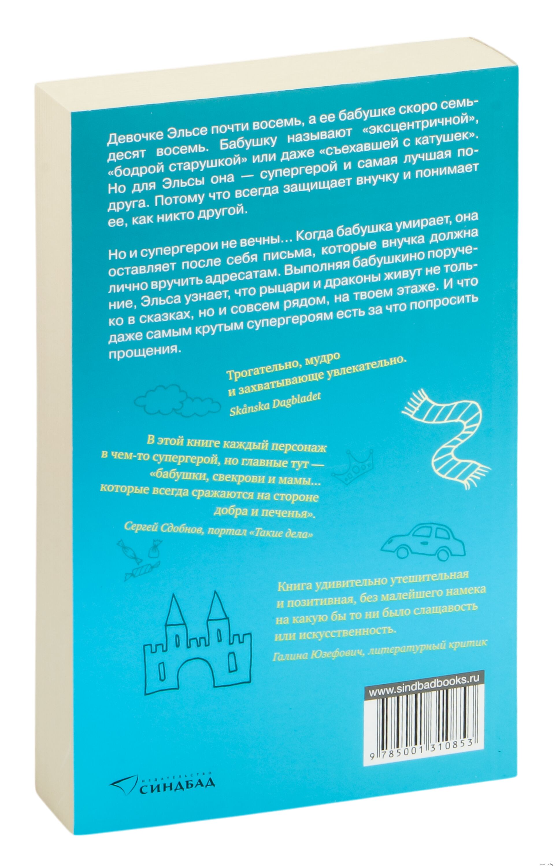 Эльзе семь, и она непохожа на других семилетних девочек. Ее бабушке семьдесят семь, и она тоже непохожа на других бабушек. Ведь мало какой бабушке взбредет в голову флиртовать с полицейским или сбежать из больницы, чтобы залезть в вольер к обезьянам. Но бабушка – лучший и единственный друг Эльсы. Каждую ночь они вместе отправляются в Просонье – удивительную страну, где время измеряется вечностями и сказками и никто не должен быть "нормальным". Однажды бабушка уходит в Просонье навсегда, оставляя Эльсе только письма. Их нужно передать тем, у кого бабушка хочет попросить прощения за свои ошибки.