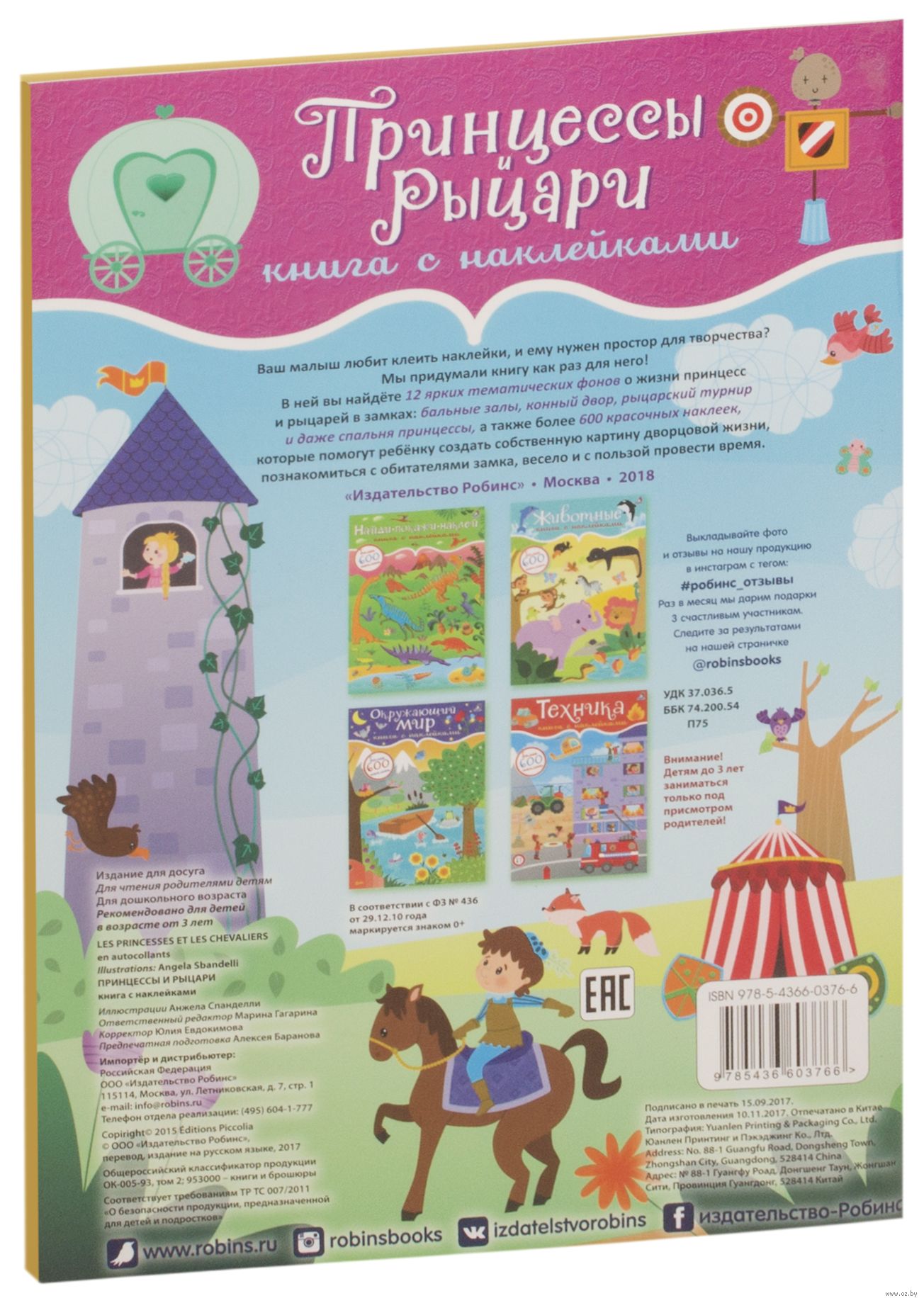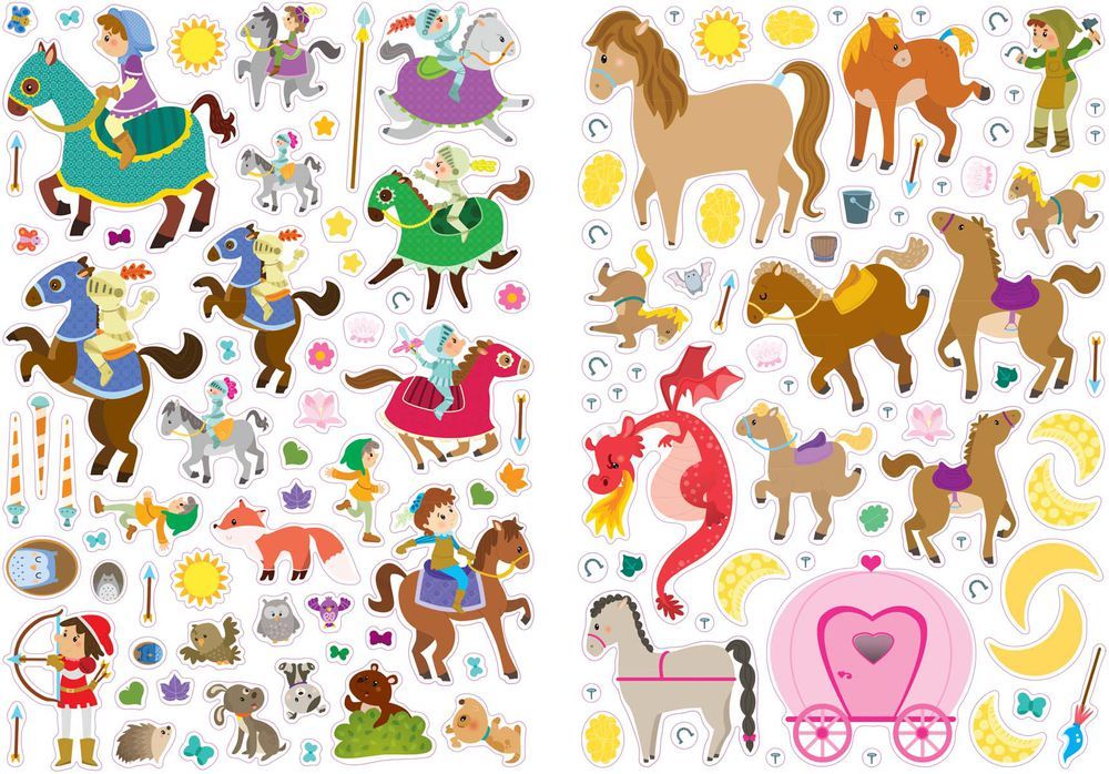 В ней вы найдёте 12 ярких тематических фонов о жизни принцесс и рыцарей в замках: бальные залы, конный двор, рыцарский турнир и даже спальня принцессы, а также более 600 разноцветных наклеек, с помощью которых ребёнок сможет создать собственную картину дворцовой жизни, познакомиться с обитателями замка, весело и с пользой провести время.