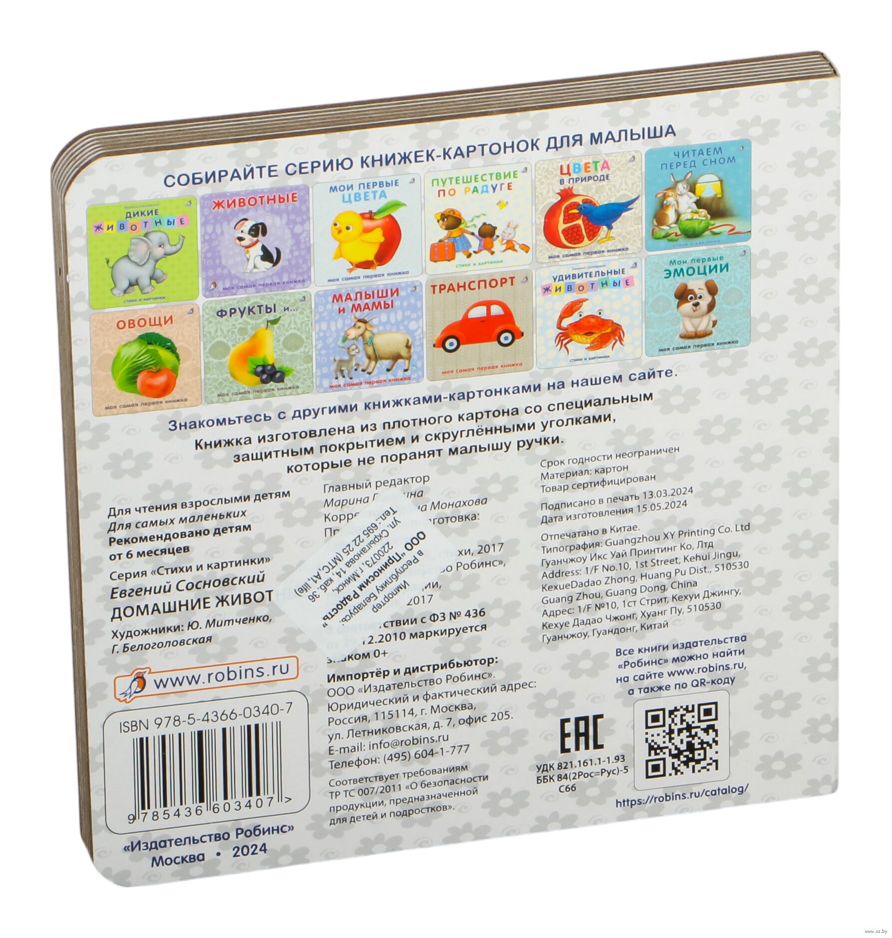 Это настоящий подарок для любопытного и любознательного малыша. На каждой страничке книжки ваш ребёнок найдёт яркие картинки и добрые стихи и впервые познакомится с домашними животными. Играя с яркими книжками, он будет развивать мелкую моторику и зрение, тренировать память, внимание и мышление. С книжкой малыш весело проведёт время и пополнит свой первый словарный запас и кругозор, повысит свою эмоциональную активность.