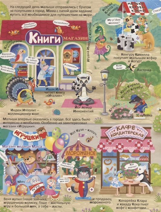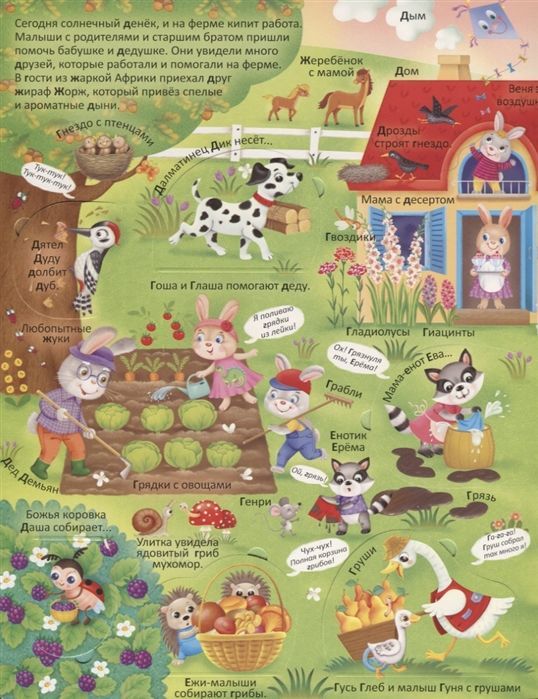 На 8 красочных тематических разворотах (дом, деревня, парк развлечений, город, пляж и другие), посвященных изучению букв и простых слогов, можно долго и с увлечением разглядывать забавные картинки и читать подписи к ним.
