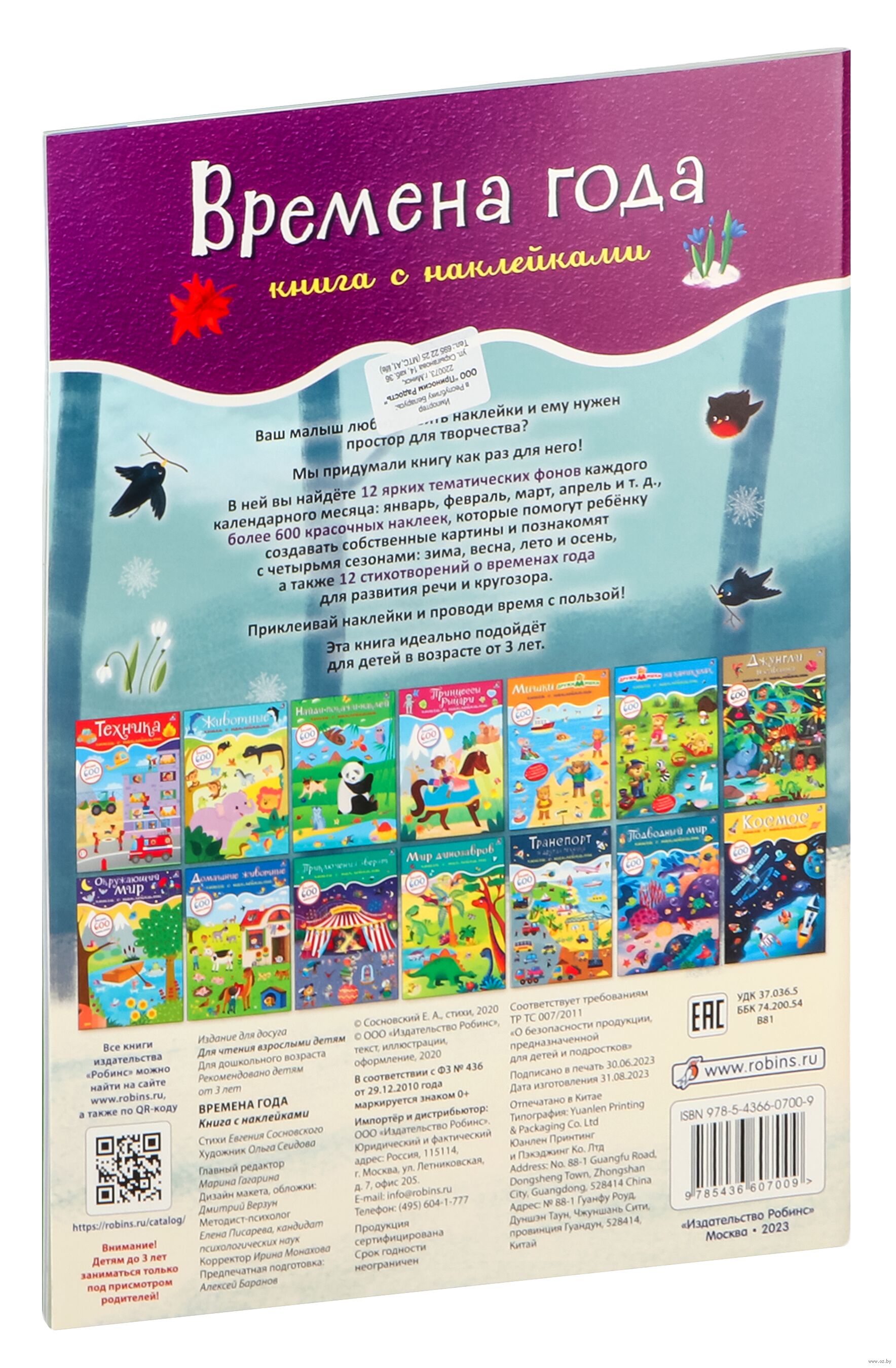 В ней вы найдёте 12 ярких тематических фонов каждого календарного месяца: январь, февраль, март, апрель и так далее, более 600 красочных наклеек, которые помогут ребёнку создавать собственные картины и познакомят с четырьмя сезонами: зима, весна, лето и осень, а также 12 стихов о временах года для развития речи и кругозора.