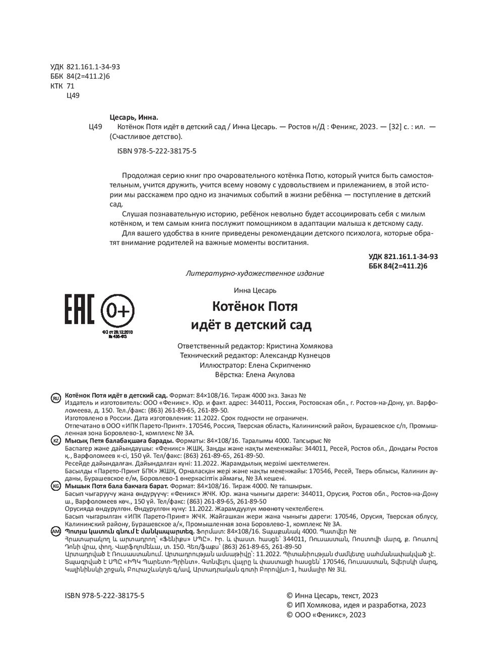 Продолжая серию книг про очаровательного котёнка Потю, который учится быть самостоятельным, учится дружить, учится всему новому с удовольствием и прилежанием, в этой истории мы расскажем про одно из значимых событий в жизни ребёнка – поступление в детский сад.