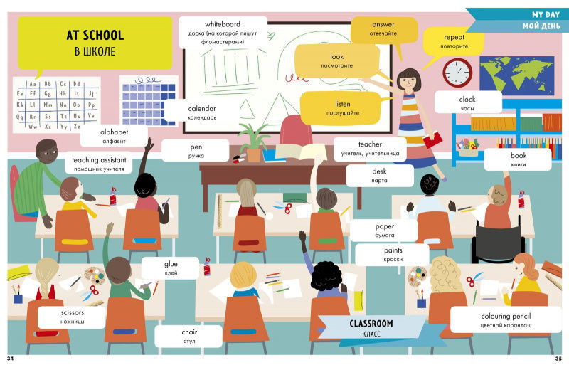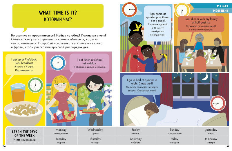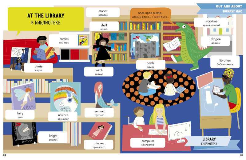 Книга включает задания разного типа: вы встретите простые предложения и диалоги, словарные слова, панорамные развороты с обозначениями новых слов и предметов. Все слова дублируются на русском языке, а в конце книги вы найдете краткий англо-русский словарик. Также в книге есть краткий гид для родителей, чтобы вы могли помочь ребенку эффективнее изучать язык.