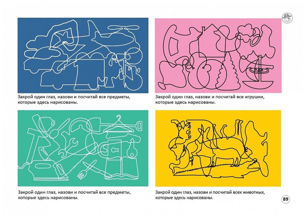 В него входят: стереокартинки (стереограммы) разных уровней сложности, видов и тематики, ответы к ним, полихроматические картинки и оптические иллюзии, различные задания для тренировки зрения и картинки для профилактики "ленивого глаза", а также гимнастика для глаз.