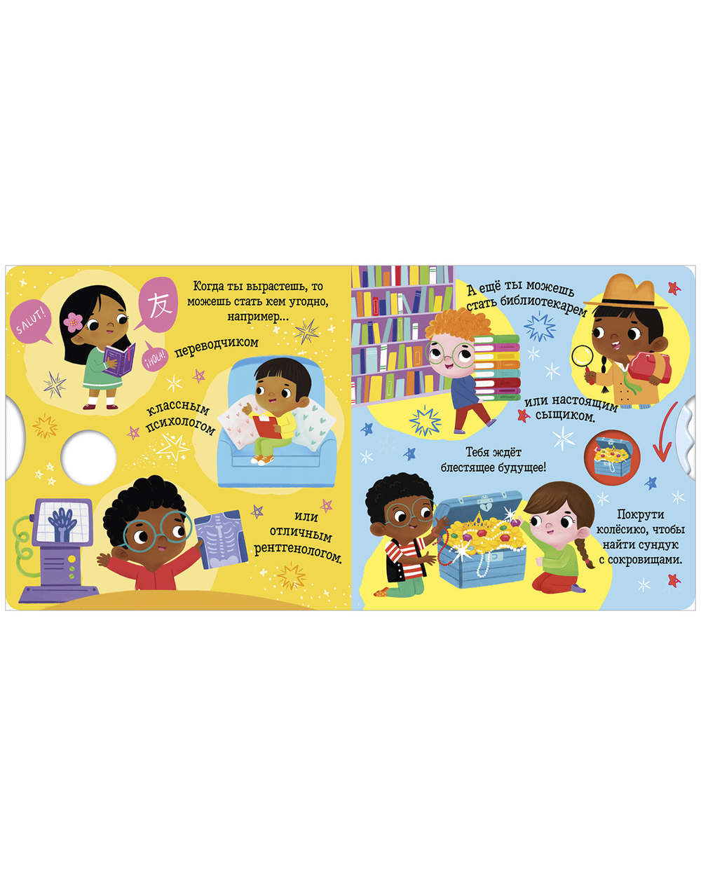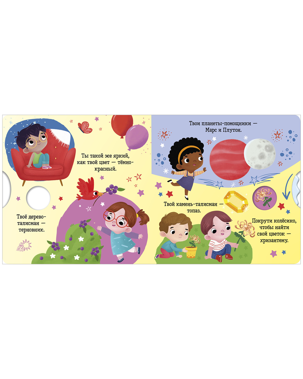 Крутите колесико, читайте коротенькие тексты и ищите ответы на вопросы. А еще тренируйте мелкую моторику, внимание и память. Плотный качественный картон, безопасные скругленные уголки – книжка прослужит долгие годы и не поранит малыша.