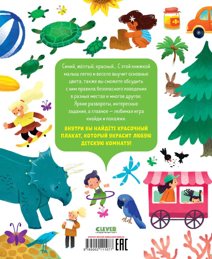 Синий, жёлтый, красный... С этой книжкой малыш легко и весело выучит основные цвета, также вы сможете обсудить с ним правила безопасного поведения в разных местах и многое другое. Яркие развороты, интересные задания, а главное – любимая игра "найди и покажи".