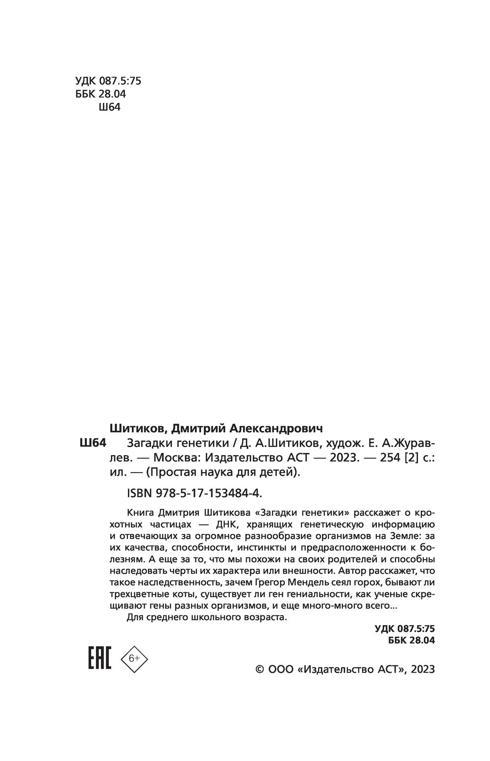 Книга Дмитрия Шитикова "Загадки генетики" расскажет о крохотных частицах – ДНК, хранящих генетическую информацию и отвечающих за огромное разнообразие организмов на Земле: за их качества, способности, инстинкты и предрасположенности к болезням. А еще за то, что мы похожи на своих родителей и способны наследовать черты их характера или внешности. Автор расскажет, что такое наследственность, зачем Грегор Мендель сеял горох, бывают ли трехцветные коты, существует ли ген гениальности, как ученые скрещивают гены разных организмов, и еще много-много всего...