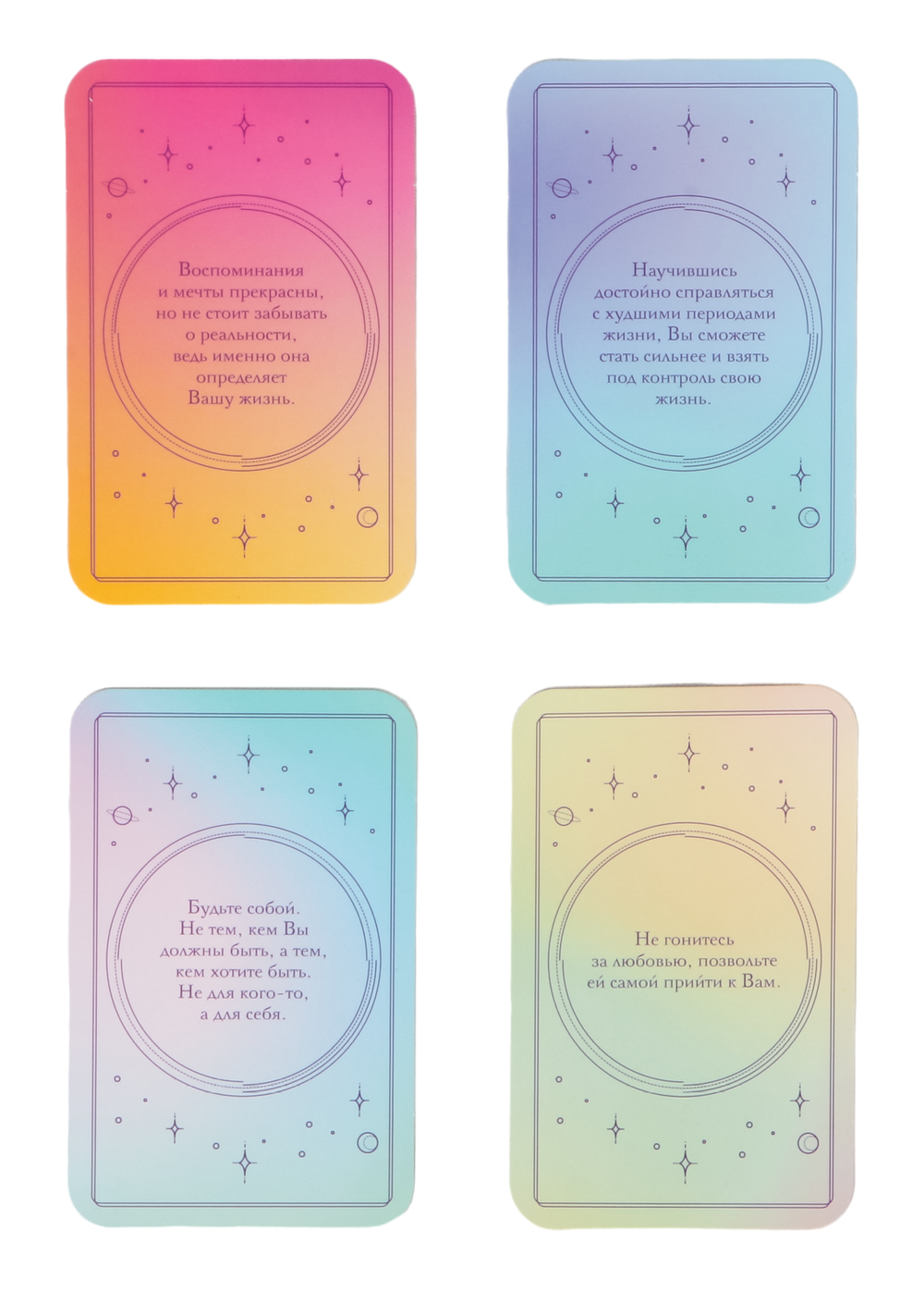 Подсказки подсознания призваны успокоить ум и позволить себе чувствовать, ощущать мир и проявиться истинным желаниям. При интуитивном созерцании своих ощущений от вытянутой карты вы восстанавливаете связь со своим подсознанием, в каждой фразе-послании есть ресурс и ответ на ваш вопрос.