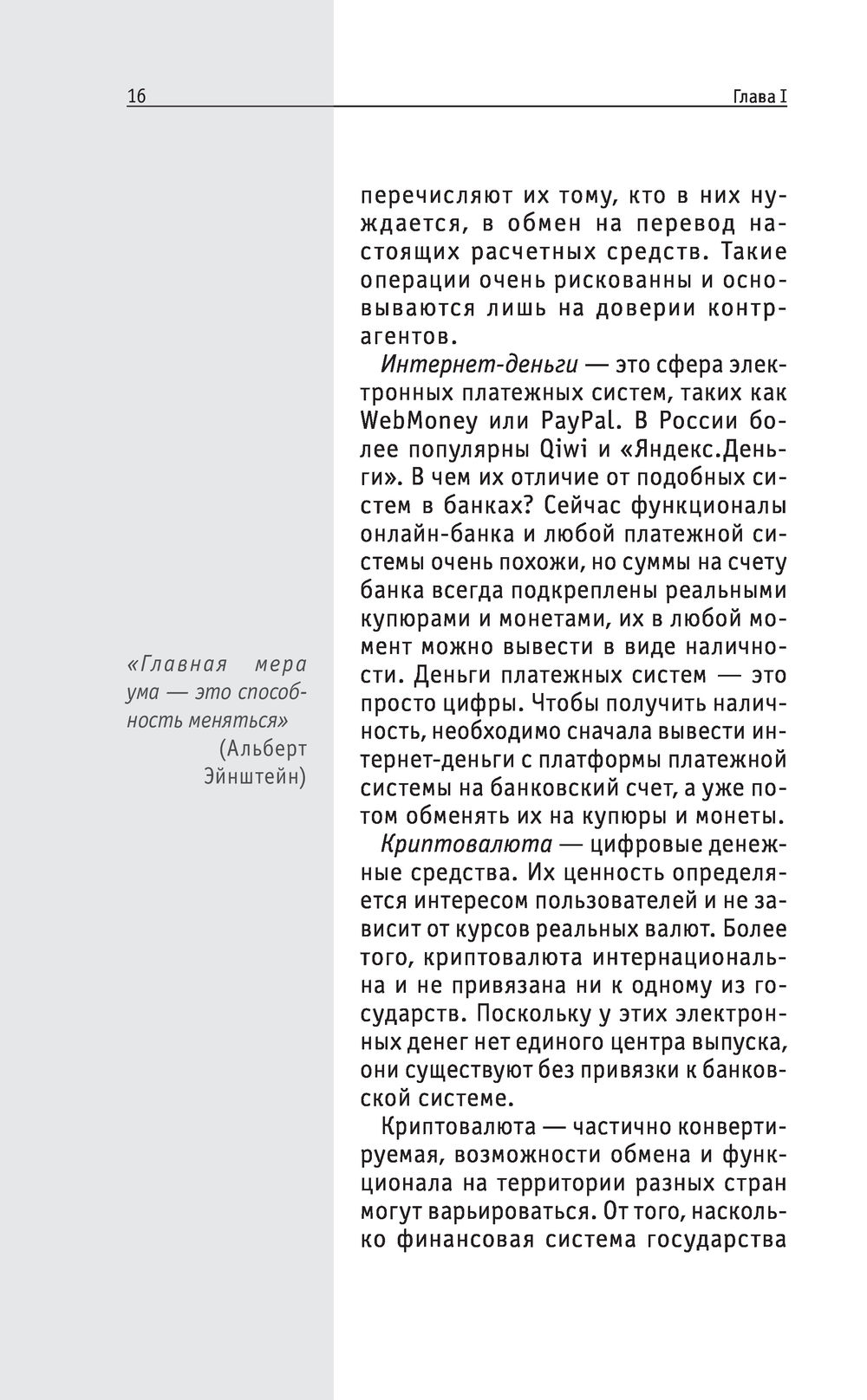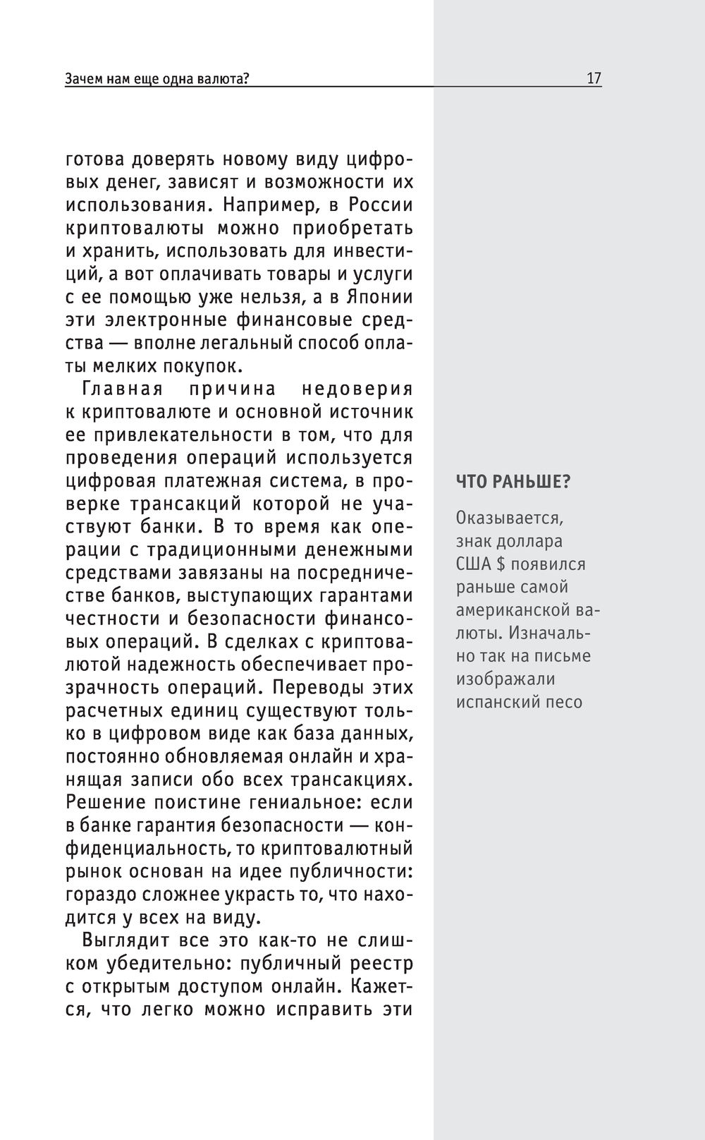Криптовалюты появились совсем недавно, но уже вызывают жаркие дискуссии и обсуждения. Кто-то считает это невероятным рывком в развитии технологий и финансов, а кто-то – величайшей финансовой пирамидой XXI века. Эта книга поможет вам составить свое собственное мнение, простым и доступным языком объясняя механизм работы, принципы хранения и все подводные камни, связанные с криптовалютами. Вы узнаете, чем биткоин отличается от других криптовалют и для чего они все нужны в принципе. А мягкая обложка и удобный карманный формат позволяют читать книгу где угодно – в метро, дома, в дороге, на отдыхе и т.д.