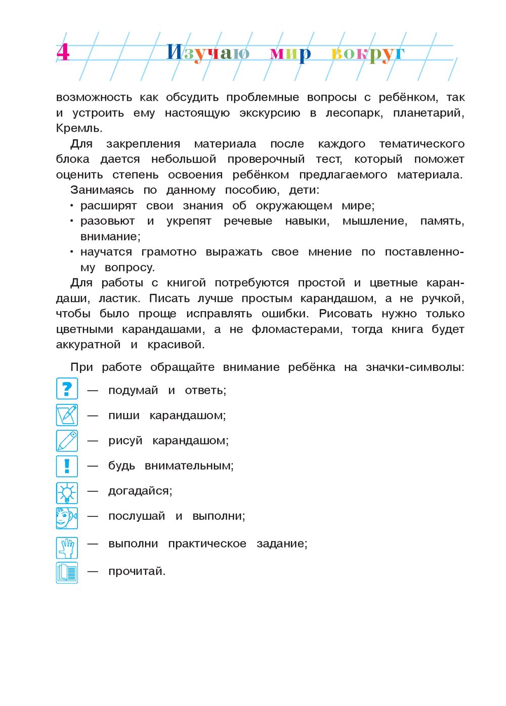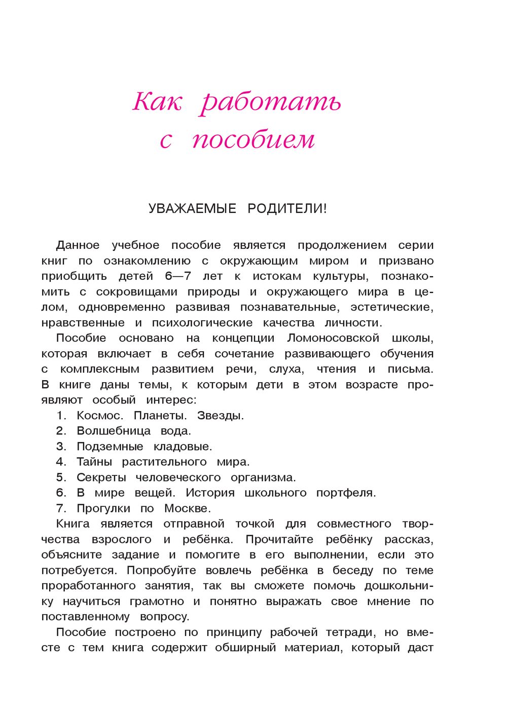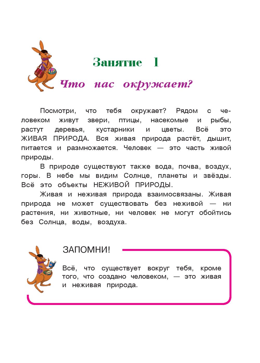 Пособие содержит обширный материал по основным темам курса "Окружающий мир", который даст возможность расширить представления дошкольника о природе, человеке, космосе, обществе, родной стране. Для закрепления материала после каждого тематического блока приведен небольшой проверочный тест, который поможет оценить степень освоения ребенком учебного материала.