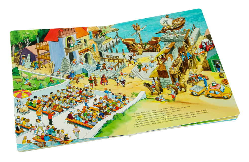 Вместе с любимыми героями ребёнок совершит увлекательное путешествие: побывает в кемпинге на берегу моря, посмотрит представление в пиратском городке, увидит львов и пингвинов в зоопарке и поможет Якобу найти Конни, которая вечно куда-то пропадает! Виммельбух – это отличная тренировка логики, внимательности и усидчивости, а ещё развитие фантазии и речи. Яркие большие иллюстрации с кучей деталей увлекут ребёнка и пробудят в нём любопытство.