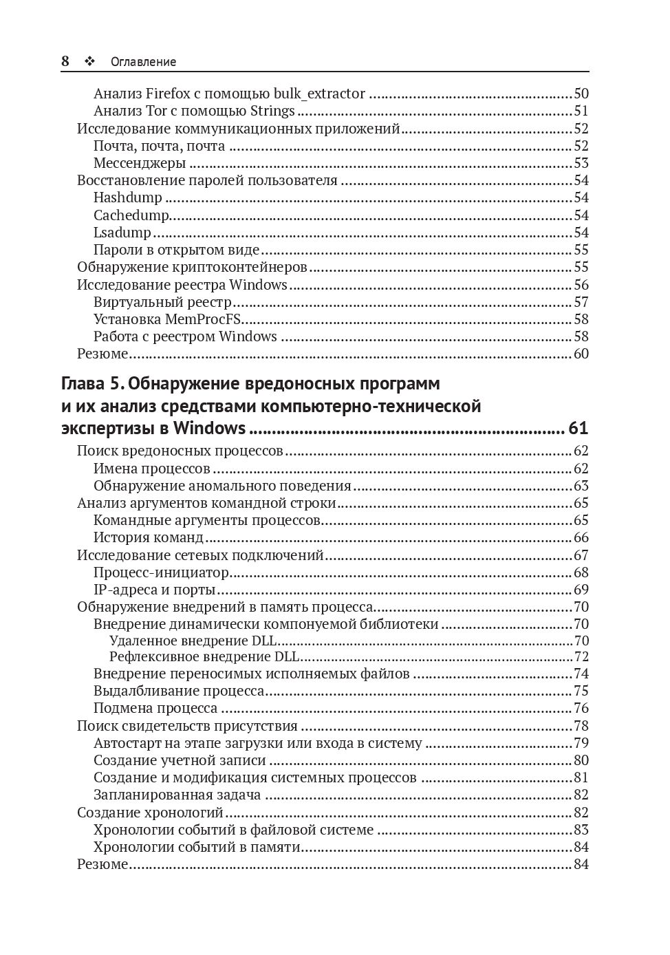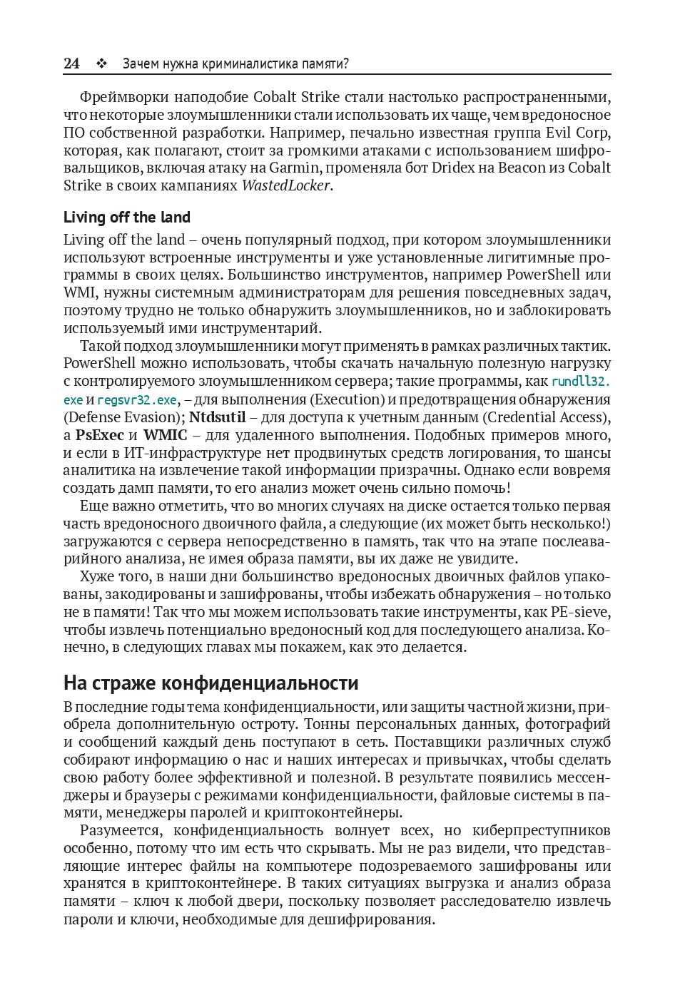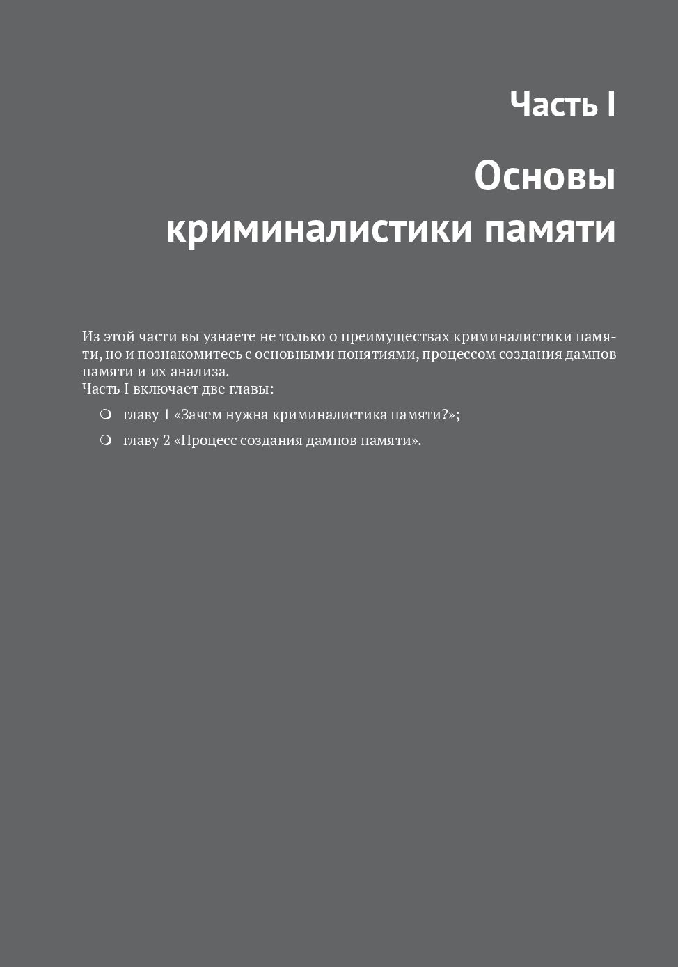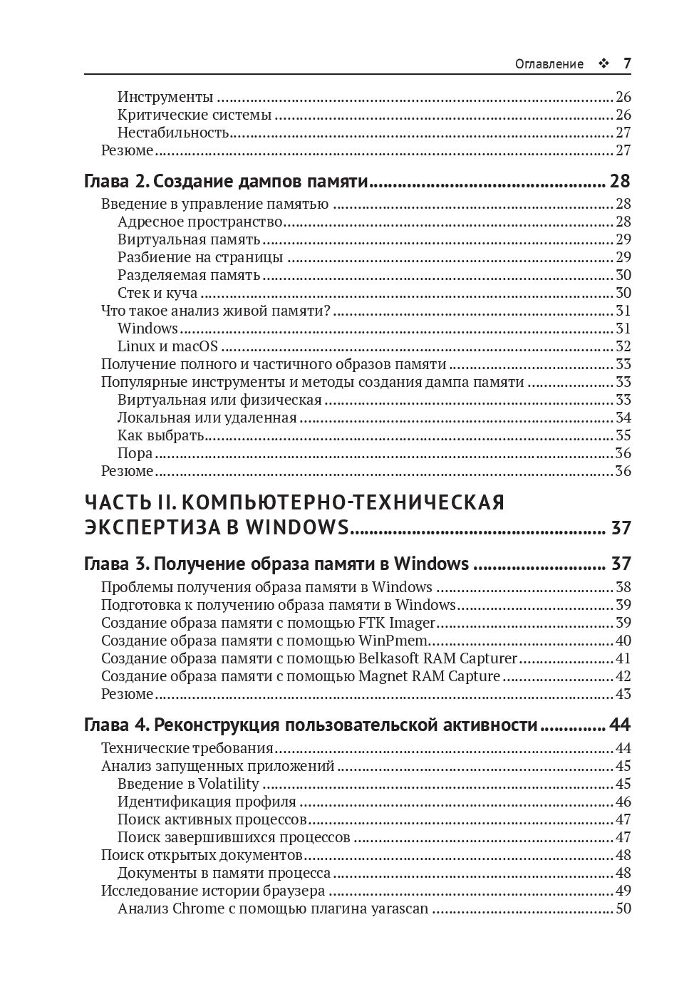 Прочтя книгу, вы сможете самостоятельно создавать и анализировать дампы памяти, изучать действия пользователя, искать следы бесфайловых атак и реконструировать действия злоумышленников.