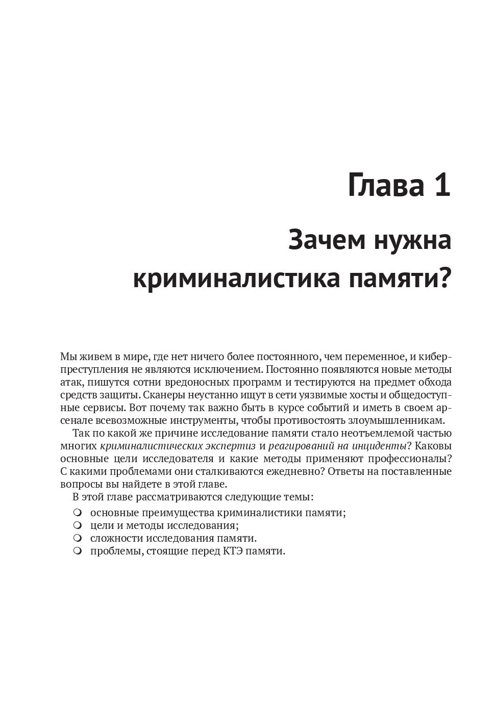 В издании принят практический подход, используются образы памяти из реальных инцидентов. Это позволяет лучше понять предмет и наработать навыки, необходимые для реагирования на инциденты и расследования сложных целевых атак. Рассматриваются элементы внутреннего устройства Windows, Linux и macOS, изучаются методы и инструменты для обнаружения, исследования и активного поиска угроз методами криминалистики.