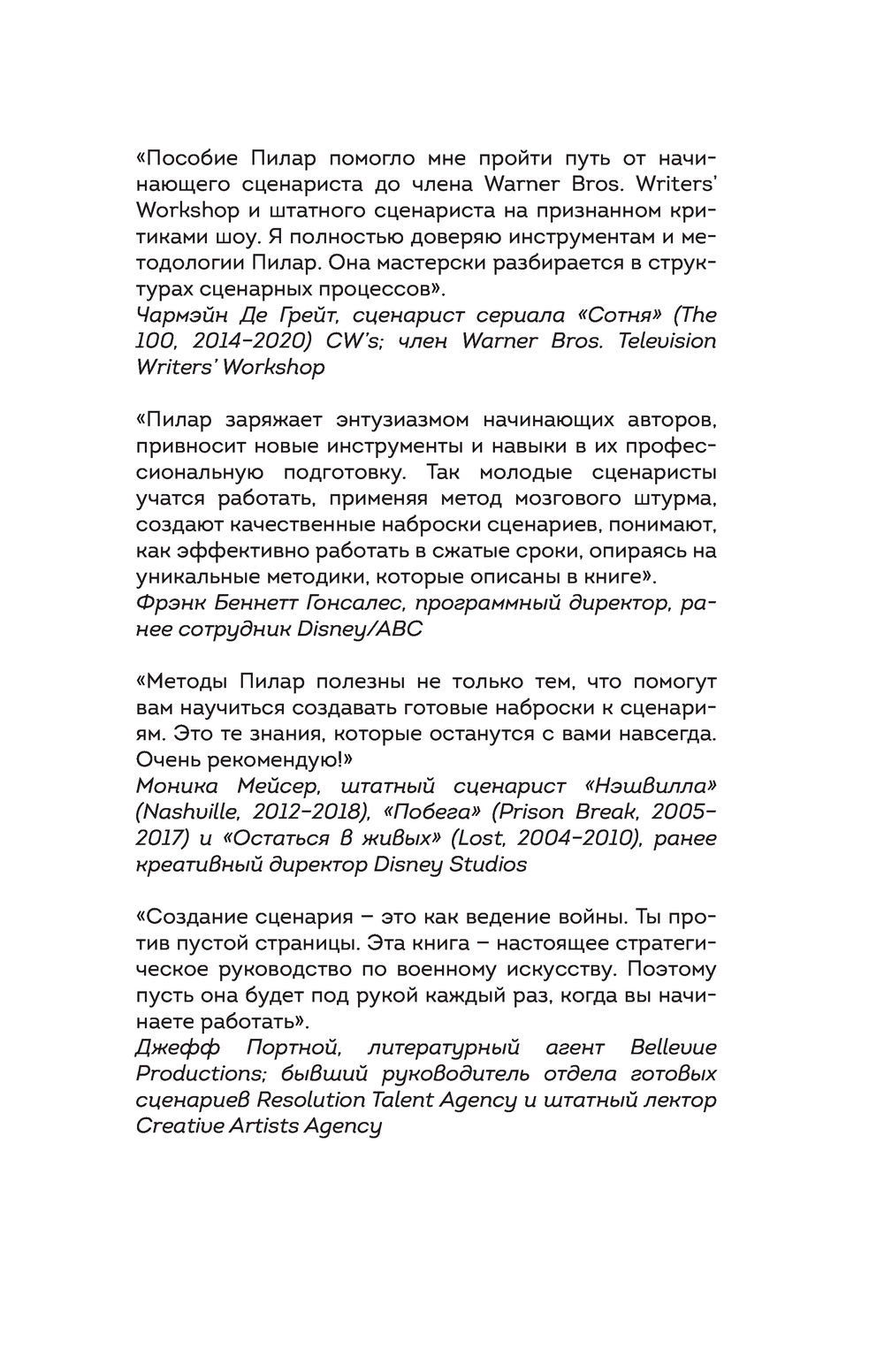 "Сценарий за чашкой кофе" – это идеальное учебное пособие для не только для начинающих сценаристов, но и помощник для уже опытных авторов. Пилар не только объясняет теорию, но и предлагает простые и эффективные упражнения для развития сценарного мастерства и писательского чутья.